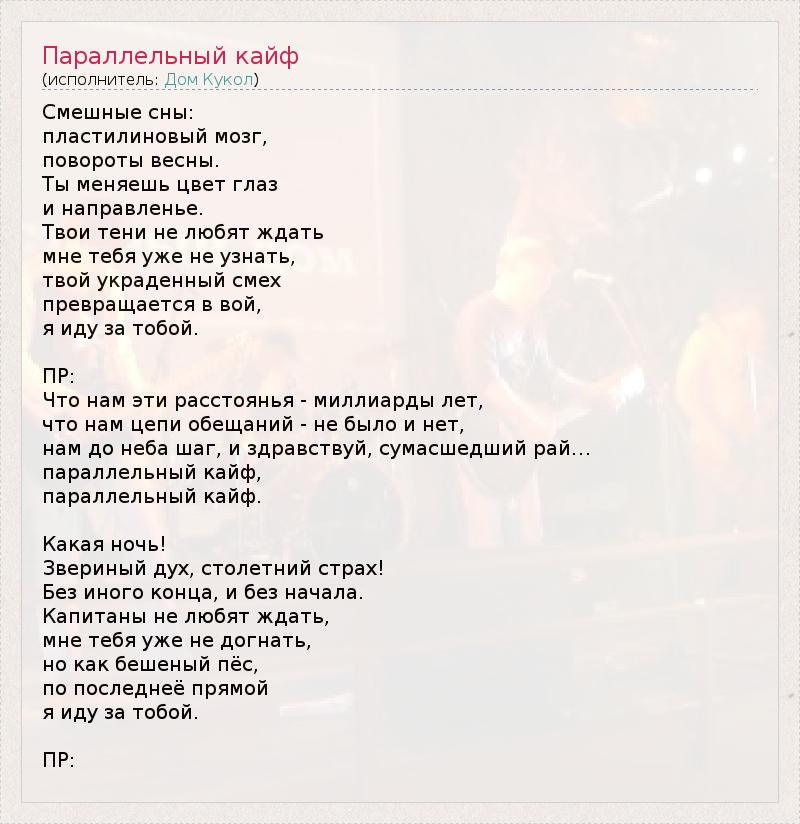 Смешные сны: пластилиновый мозг, повороты весны. Ты меняешь цвет глаз и направленье. Твои тени не любят ждать мне тебя уже не узнать, твой украденный смех превращается в вой, я иду за тобой. ПР: Что нам эти расстоянья - миллиарды лет, что нам цепи обещаний - не было и нет, нам до неба шаг, и здравствуй, сумасшедший рай… параллельный кайф, параллельный кайф. Какая ночь! Звериный дух, столетний страх! Без иного конца, и без начала. Капитаны не любят ждать, мне тебя уже не догнать, но как бешеный пёс, по последнеё прямой я иду за тобой. ПР: