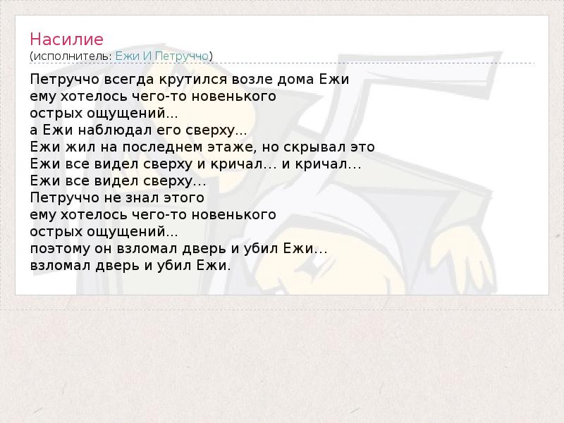 Петруччо всегда крутился возле дома Ежи ему хотелось чего-то новенького острых ощущений... а Ежи наблюдал его сверху... Ежи жил на последнем этаже, но скрывал это Ежи все видел сверху и кричал… и кричал… Ежи все видел сверху… Петруччо не знал этого ему хотелось чего-то новенького острых ощущений... поэтому он взломал дверь и убил Ежи… взломал дверь и убил Ежи.