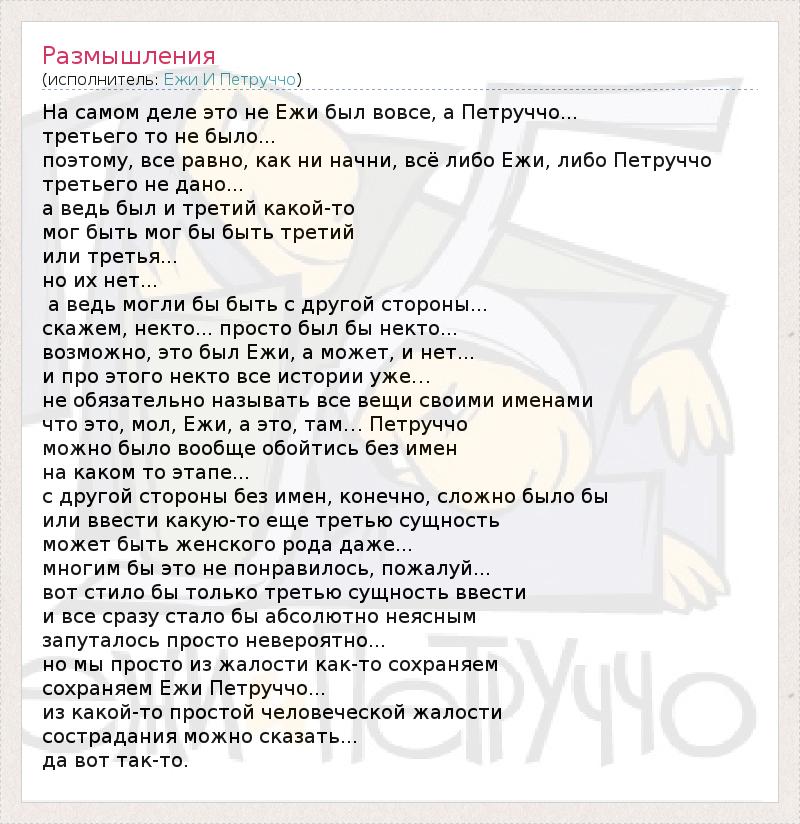 На самом деле это не Ежи был вовсе, а Петруччо... третьего то не было... поэтому, все равно, как ни начни, всё либо Ежи, либо Петруччо третьего не дано... а ведь был и третий какой-то мог быть мог бы быть третий или третья... но их нет... а ведь могли бы быть с другой стороны... скажем, некто... просто был бы некто... возможно, это был Ежи, а может, и нет... и про этого некто все истории уже… не обязательно называть все вещи своими именами что это, мол, Ежи, а это, там… Петруччо можно было вообще обойтись без имен на каком то этапе... с другой стороны без имен, конечно, сложно было бы или ввести какую-то еще третью сущность может быть женского рода даже... многим бы это не понравилось, пожалуй... вот стило бы только третью сущность ввести и все сразу стало бы абсолютно неясным запуталось просто невероятно... но мы просто из жалости как-то сохраняем сохраняем Ежи Петруччо... из какой-то простой человеческой жалости сострадания можно сказать... да вот так-то.