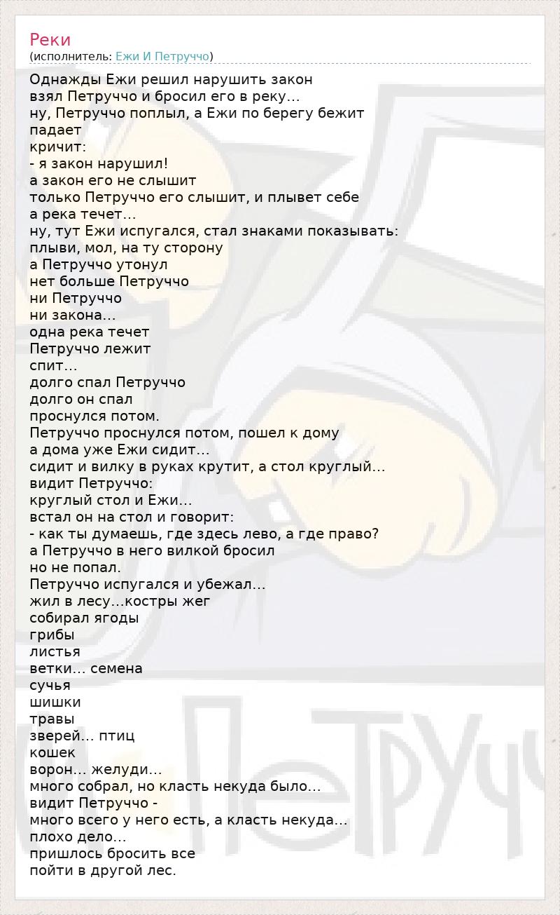 Однажды Ежи решил нарушить закон взял Петруччо и бросил его в реку… ну, Петруччо поплыл, а Ежи по берегу бежит падает кричит: - я закон нарушил! а закон его не слышит только Петруччо его слышит, и плывет себе а река течет… ну, тут Ежи испугался, стал знаками показывать: плыви, мол, на ту сторону а Петруччо утонул нет больше Петруччо ни Петруччо ни закона… одна река течет Петруччо лежит спит… долго спал Петруччо долго он спал проснулся потом. Петруччо проснулся потом, пошел к дому а дома уже Ежи сидит… сидит и вилку в руках крутит, а стол круглый… видит Петруччо: круглый стол и Ежи… встал он на стол и говорит: - как ты думаешь, где здесь лево, а где право? а Петруччо в него вилкой бросил но не попал. Петруччо испугался и убежал… жил в лесу…костры жег собирал ягоды грибы листья ветки… семена сучья шишки травы зверей… птиц кошек ворон… желуди… много собрал, но класть некуда было… видит Петруччо - много всего у него есть, а класть некуда… плохо дело… пришлось бросить все пойти в другой лес.