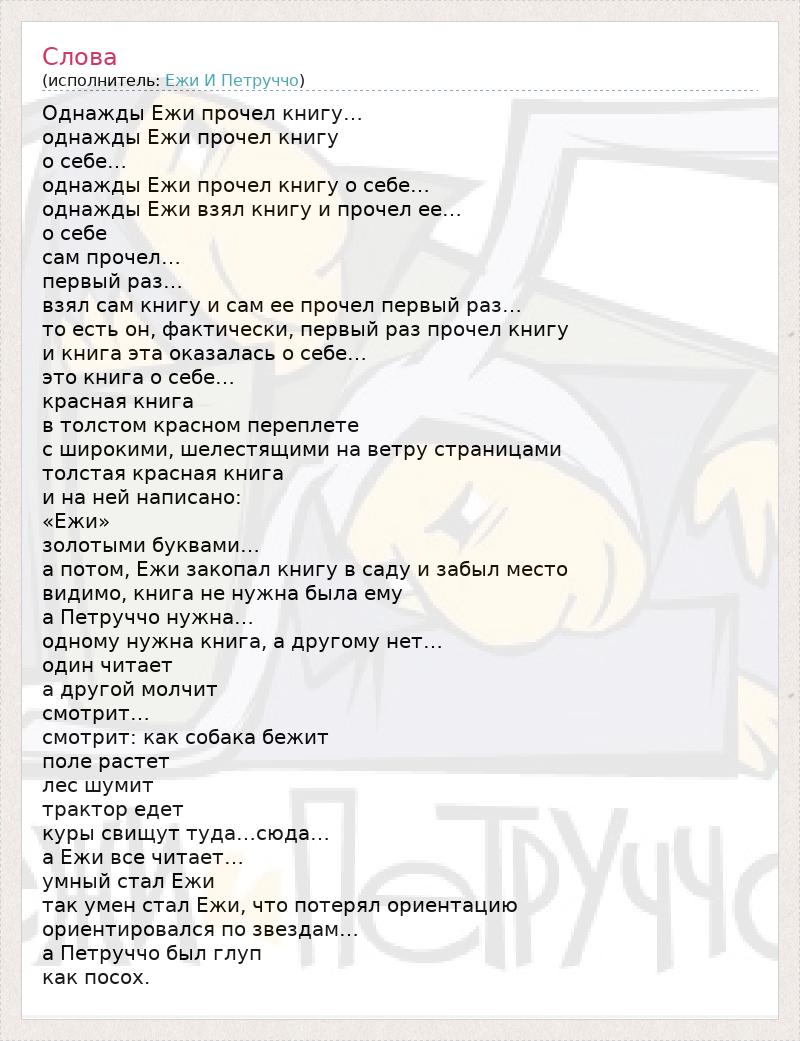 Однажды Ежи прочел книгу… однажды Ежи прочел книгу о себе… однажды Ежи прочел книгу о себе… однажды Ежи взял книгу и прочел ее… о себе сам прочел… первый раз… взял сам книгу и сам ее прочел первый раз… то есть он, фактически, первый раз прочел книгу и книга эта оказалась о себе… это книга о себе… красная книга в толстом красном переплете с широкими, шелестящими на ветру страницами толстая красная книга и на ней написано: «Ежи» золотыми буквами… а потом, Ежи закопал книгу в саду и забыл место видимо, книга не нужна была ему а Петруччо нужна… одному нужна книга, а другому нет… один читает а другой молчит смотрит… смотрит: как собака бежит поле растет лес шумит трактор едет куры свищут туда…сюда… а Ежи все читает… умный стал Ежи так умен стал Ежи, что потерял ориентацию ориентировался по звездам… а Петруччо был глуп как посох.