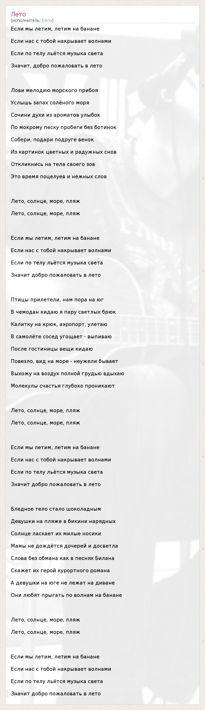 Если мы летим, летим на банане Если нас с тобой накрывает волнами Если по телу льётся музыка света Значит, добро пожаловать в лето Лови мелодию морского прибоя Услышь запах солёного моря Сочини духи из ароматов улыбок По мокрому песку пробеги без ботинок Собери, подари подруге венок Из картинок цветных и радужных снов Откликнись на тела своего зов Это время поцелуев и нежных слов Лето, солнце, море, пляж Лето, солнце, море, пляж Если мы летим, летим на банане Если нас с тобой накрывает волнами Если по телу льётся музыка света Значит добро пожаловать в лето Птицы прилетели, нам пора на юг В чемодан кидаю я пару светлых брюк Калитку на крюк, аэропорт, улетаю В самолёте сосед угощает - выпиваю После гостиницы вещи кидаю Повезло, вид на море - неужели бывает Выхожу на воздух полной грудью вдыхаю Молекулы счастья глубоко проникают Лето, солнце, море, пляж Лето, солнце, море, пляж Если мы летим, летим на банане Если нас с тобой накрывает волнами Если по телу льётся музыка света Значит добро пожаловать в лето Бледное тело стало шоколадным Девушки на пляже в бикини нарядных Солнце ласкает их милые носики Мамы не дождётся дочерей и досветла Слова без обмана как в песнях Билана Скажет их герой курортного романа А девушки на юге не лежат на диване Они любят прыгать по волнам на банане Лето, солнце, море, пляж Лето, солнце, море, пляж Если мы летим, летим на банане Если нас с тобой накрывает волнами Если по телу льётся музыка света Значит добро пожаловать в лето