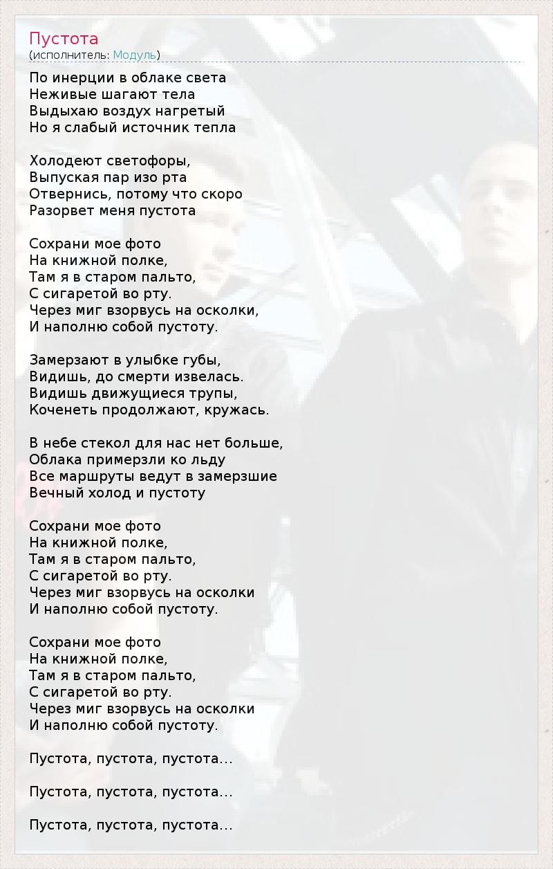 Это интересно:Музыкальный коллектив «МODУЛЬ» хорошо известен посетителям многих московских и региональных клубов, являясь активным участником множества depeche- и синт-поп-вечеринок, концертов и фестивалей. Мелодичное и энергичное звучание группы можно охарактеризовать как «альтернативный поп». Группа «МODУЛЬ» Рома Лямцев (вокал) Кирилл Швец (гитара) Миша Козодаев (ударные)... продолжение
