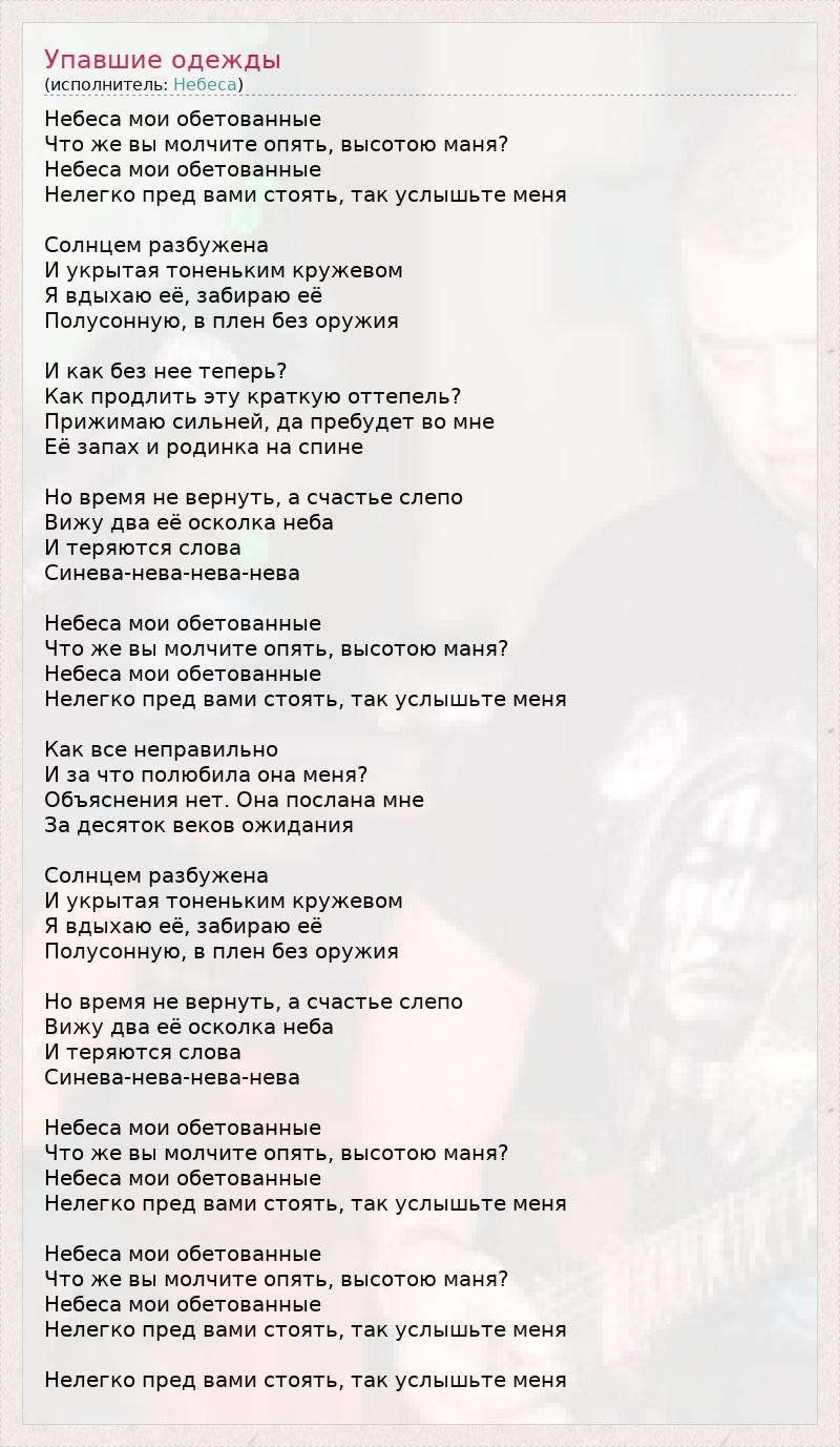 Небеса мои обетованные Что же вы молчите опять, высотою маня? Небеса мои обетованные Нелегко пред вами стоять, так услышьте меня Солнцем разбужена И укрытая тоненьким кружевом Я вдыхаю её, забираю её Полусонную, в плен без оружия И как без нее теперь? Как продлить эту краткую оттепель? Прижимаю сильней, да пребудет во мне Её запах и родинка на спине Но время не вернуть, а счастье слепо Вижу два её осколка неба И теряются слова Синева-нева-нева-нева Небеса мои обетованные Что же вы молчите опять, высотою маня? Небеса мои обетованные Нелегко пред вами стоять, так услышьте меня Как все неправильно И за что полюбила она меня? Объяснения нет. Она послана мне За десяток веков ожидания Солнцем разбужена И укрытая тоненьким кружевом Я вдыхаю её, забираю её Полусонную, в плен без оружия Но время не вернуть, а счастье слепо Вижу два её осколка неба И теряются слова Синева-нева-нева-нева Небеса мои обетованные Что же вы молчите опять, высотою маня? Небеса мои обетованные Нелегко пред вами стоять, так услышьте меня Небеса мои обетованные Что же вы молчите опять, высотою маня? Небеса мои обетованные Нелегко пред вами стоять, так услышьте меня Нелегко пред вами стоять, так услышьте меня