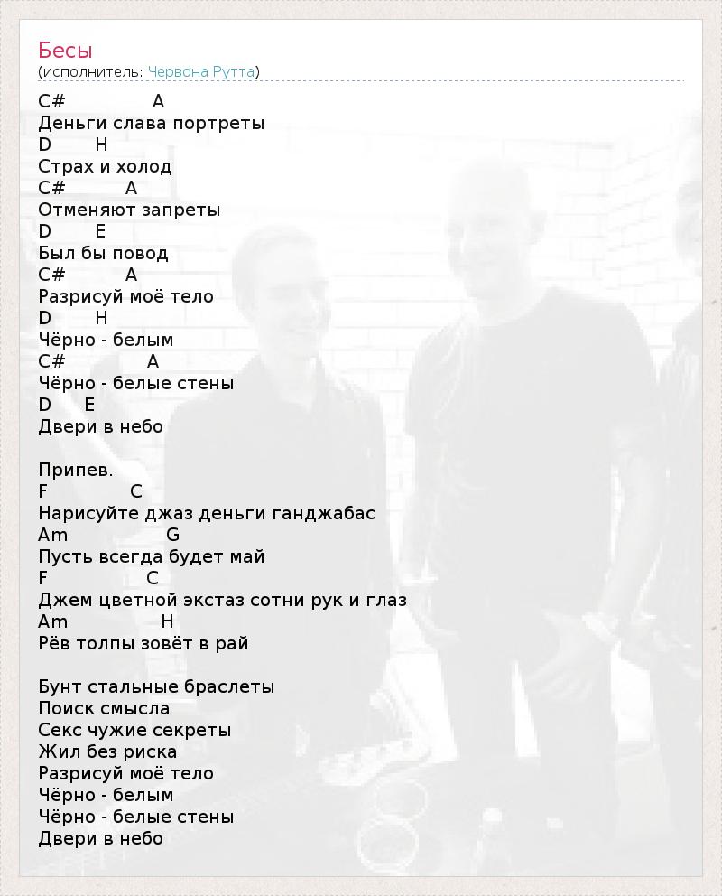 C# A Деньги слава портреты D H Страх и холод C# A Отменяют запреты D E Был бы повод C# A Разрисуй моё тело D H Чёрно - белым C# A Чёрно - белые стены D E Двери в небо Припев. F C Нарисуйте джаз деньги ганджабас Am G Пусть всегда будет май F C Джем цветной экстаз сотни рук и глаз Am H Рёв толпы зовёт в рай Бунт стальные браслеты Поиск смысла Секс чужие секреты Жил без риска Разрисуй моё тело Чёрно - белым Чёрно - белые стены Двери в небо