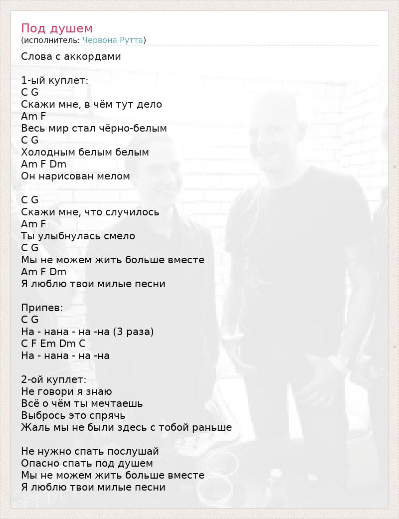 Слова с аккордами 1-ый куплет: C G Скажи мне, в чём тут дело Am F Весь мир стал чёрно-белым C G Холодным белым белым Am F Dm Он нарисован мелом C G Скажи мне, что случилось Am F Ты улыбнулась смело C G Мы не можем жить больше вместе Am F Dm Я люблю твои милые песни Припев: C G На - нана - на -на (3 раза) C F Em Dm C На - нана - на -на 2-ой куплет: Не говори я знаю Всё о чём ты мечтаешь Выбрось это спрячь Жаль мы не были здесь с тобой раньше Не нужно спать послушай Опасно спать под душем Мы не можем жить больше вместе Я люблю твои милые песни