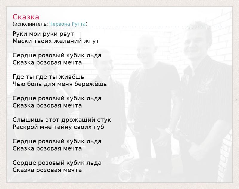 Руки мои руки рвут Маски твоих желаний жгут Сердце розовый кубик льда Сказка розовая мечта Где ты где ты живёшь Чью боль для меня бережёшь Сердце розовый кубик льда Сказка розовая мечта Слышишь этот дрожащий стук Раскрой мне тайну своих губ Сердце розовый кубик льда Сказка розовая мечта Сердце розовый кубик льда Сказка розовая мечта