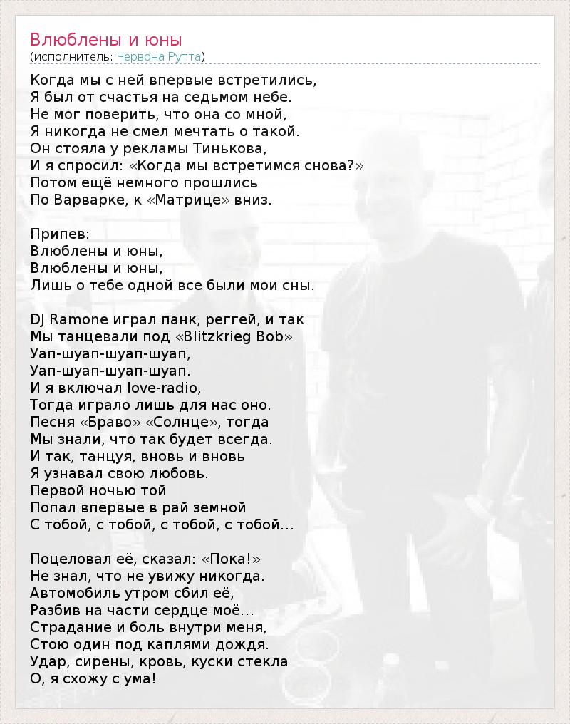 Когда мы с ней впервые встретились, Я был от счастья на седьмом небе. Не мог поверить, что она со мной, Я никогда не смел мечтать о такой. Он стояла у рекламы Тинькова, И я спросил: «Когда мы встретимся снова?» Потом ещё немного прошлись По Варварке, к «Матрице» вниз. Припев: Влюблены и юны, Влюблены и юны, Лишь о тебе одной все были мои сны. DJ Ramone играл панк, реггей, и так Мы танцевали под «Blitzkrieg Bob» Уап-шуап-шуап-шуап, Уап-шуап-шуап-шуап. И я включал love-radio, Тогда играло лишь для нас оно. Песня «Браво» «Солнце», тогда Мы знали, что так будет всегда. И так, танцуя, вновь и вновь Я узнавал свою любовь. Первой ночью той Попал впервые в рай земной С тобой, с тобой, с тобой, с тобой… Поцеловал её, сказал: «Пока!» Не знал, что не увижу никогда. Автомобиль утром сбил её, Разбив на части сердце моё… Страдание и боль внутри меня, Стою один под каплями дождя. Удар, сирены, кровь, куски стекла О, я схожу с ума!