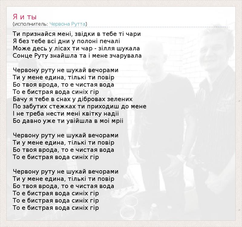 Ты признайся мне, откуда у тебя те чары Я без тебя все дни в плену печали Может где-то в лесах ты чар-зелье искала Солнце Руту нашла и она меня очаровала Червону руту не ищи вечерами Ты у меня единственная, Только ты поверь Потому что твоя красота, то есть чистая вода То е быстрая вода синих гор Вижу я тебя в снах в дубравы зеленых По забытых тропам ты приходишь ко мне I не надо нести мне цветок надii Ибо давно уже ты вошла в моi мрii Червону руту не ищи вечерами Ты у меня единственная, Только ты поверь Потому что твоя красота, то есть чистая вода То е быстрая вода синих гор Червону руту не ищи вечерами Ты у меня единственная, Только ты поверь Потому что твоя красота, то есть чистая вода То быстрая вода синих гор То быстрая вода синих гор То быстрая вода синих гор
