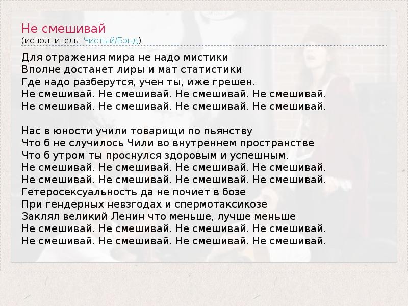 Для отражения мира не надо мистики Вполне достанет лиры и мат статистики Где надо разберутся, учен ты, иже грешен. Не смешивай. Не смешивай. Не смешивай. Не смешивай. Не смешивай. Не смешивай. Не смешивай. Не смешивай. Нас в юности учили товарищи по пьянству Что б не случилось Чили во внутреннем пространстве Что б утром ты проснулся здоровым и успешным. Не смешивай. Не смешивай. Не смешивай. Не смешивай. Не смешивай. Не смешивай. Не смешивай. Не смешивай. Гетеросексуальность да не почиет в бозе При гендерных невзгодах и спермотаксикозе Заклял великий Ленин что меньше, лучше меньше Не смешивай. Не смешивай. Не смешивай. Не смешивай. Не смешивай. Не смешивай. Не смешивай. Не смешивай.
