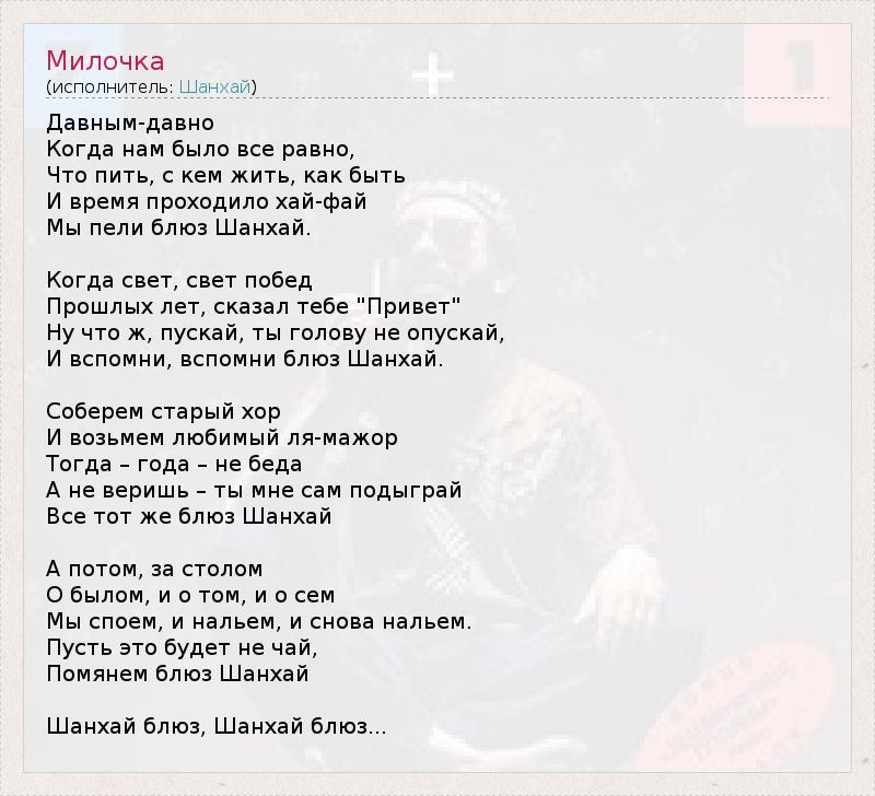 Давным-давно Когда нам было все равно, Что пить, с кем жить, как быть И время проходило хай-фай Мы пели блюз Шанхай. Когда свет, свет побед Прошлых лет, сказал тебе "Привет" Ну что ж, пускай, ты голову не опускай, И вспомни, вспомни блюз Шанхай. Соберем старый хор И возьмем любимый ля-мажор Тогда – года – не беда А не веришь – ты мне сам подыграй Все тот же блюз Шанхай А потом, за столом О былом, и о том, и о сем Мы споем, и нальем, и снова нальем. Пусть это будет не чай, Помянем блюз Шанхай Шанхай блюз, Шанхай блюз...