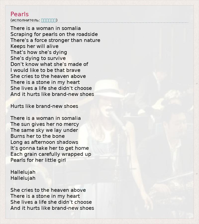 В Сомали есть женщина, Которая перебирает жемчужины на обочине. Благодаря силе, более властной, чем сама природа, Она ещё жива. Так она умирает, Умирает, чтобы выжить. Я не знаю, из чего она сделана, Я бы хотела быть такой же мужественной. Она взывает к небесам над ней И мое сердце каменеет. Она не выбирала такую жизнь, И это ранит, как неразношенные ботинки. Ранит, как неразношенные ботинки... В Сомали есть женщина, Солнце ее не щадит. То же самое небо, под которым ходим и мы, Сжигает ее до костей. Дорога домой так длинна, Как длинны послеполуденные тени. Каждое зернышко тщательно завернуто - Жемчужины для ее дочурки. Аллилуйя! Аллилуйя! Она взывает к небесам над ней И мое сердце каменеет. Она не выбирала такую жизнь, И это ранит, как неразношенные ботинки...