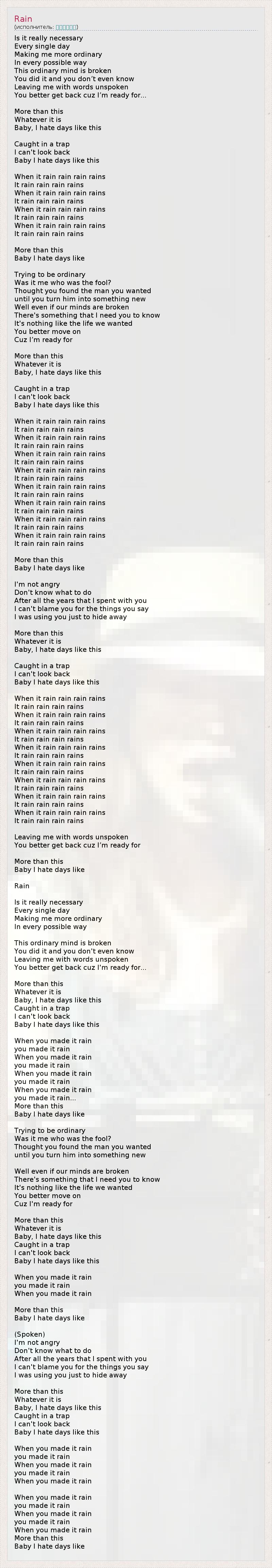 Это действительно необходимо Каждый день Всеми возможными способами Делать меня все более заурядным? Мои заурядное сознание рушится... Это сделала ты, даже не заметив. Ты оставляешь меня с теми словами, которые не были сказаны Лучше забери их назад, потому что я готов Больше, чем Когда-либо. Детка, я ненавижу дни подобные этому! Пойманный в западню, Я не могу оглянуться Детка, я ненавижу дни, подобные этому! Когда дождь идет и идет, Идет и идет. Когда дождь идет и идет, Идет и идет. Когда дождь идет и идет, Идет и идет. Когда дождь идет и идет, Идет и идет. Больше, чем это, Детка, я ненавижу дни подобные этому! Пытаясь быть заурядным, Кто вел себя глупо? Думала, ты нашла мужчину мечты, А потом превратила его нечто совершенно иное. Что ж, даже если наши мысли распадутся, Есть что-то, что мне нужно знать, Это не похоже на жизнь, о которой мы мечтали. Лучше двигайся дальше, Потому что я готов Больше, чем Когда-либо. Детка, я ненавижу дни подобные этому! Пойманный в западню, Я не могу оглянуться Детка, я ненавижу дни, подобные этому! Когда дождь идет и идет, Идет и идет. Когда дождь идет и идет, Идет и идет. Когда дождь идет и идет, Идет и идет. Когда дождь идет и идет, Идет и идет. Когда дождь идет и идет, Идет и идет. Когда дождь идет и идет, Идет и идет. Когда дождь идет и идет, Идет и идет. Когда дождь идет и идет, Идет и идет. Больше, чем это, Детка, я ненавижу дни подобные этому! Я не сержусь, просто Не знаю, что делать После всех лет, что мы провели вместе. Я не могу винить тебя за то, что ты сказала, Потому что я использовал тебя только для того, чтобы скрыться. Больше, чем Когда-либо Детка, я ненавижу дни подобные этому! Пойманный в западню, Я не могу оглянуться Детка, я ненавижу дни, подобные этому! Когда дождь идет и идет, Идет и идет. Когда дождь идет и идет, Идет и идет. Когда дождь идет и идет, Идет и идет. Когда дождь идет и идет, Идет и идет. Когда дождь идет и идет, Идет и идет. Когда дождь идет и идет, Идет и идет. Когда дождь идет и идет, Идет и идет. Когда дождь идет и идет, Идет и идет. Ты оставляешь меня с теми словами, которые не были сказаны, Лучше забери их назад, потому что я готов... Больше, чем это, Детка, я ненавижу дни подобные этому! Дождь (Dan_UndeaD из Northrend) Действительно необходимо Каждый день Делать меня менее необычным Любыми путями. Самый обычный разум сломался, Ты сделала это, даже не зная, Оставив меня с невысказанными словами. Тебе лучше вернуться, потому что я готов… К большему, Чем бы оно не было. Детка, я ненавижу такие дни, Когда я в ловушке, Я не могу взглянуть назад, Детка, я ненавижу такие дни… Когда из-за тебя пролился дождь, Из-за тебя пролился дождь… Когда из-за тебя пролился дождь, Из-за тебя пролился дождь… Когда из-за тебя пролился дождь, Из-за тебя пролился дождь… Когда из-за тебя пролился дождь, Из-за тебя пролился дождь… Более того, Детка, я ненавижу такие дни. Пытаюсь быть обыкновенным, Неужели я был тем глупцом? Ты думала, что нашла своего мужчину, Пока не превратила его во что-то другое… Пусть даже наши мысли расколоты, Всё равно ты должна кое-что знать. Эта жизнь совсем не похожа на ту, какой ты желала. Лучше подвинься, Ведь я готов… К большему, Чем бы оно не было. Детка, я ненавижу такие дни, Когда я в ловушке, Я не могу взглянуть назад, Детка, я ненавижу такие дни… Когда из-за тебя пролился дождь, Из-за тебя пролился дождь… Когда из-за тебя пролился дождь, Б