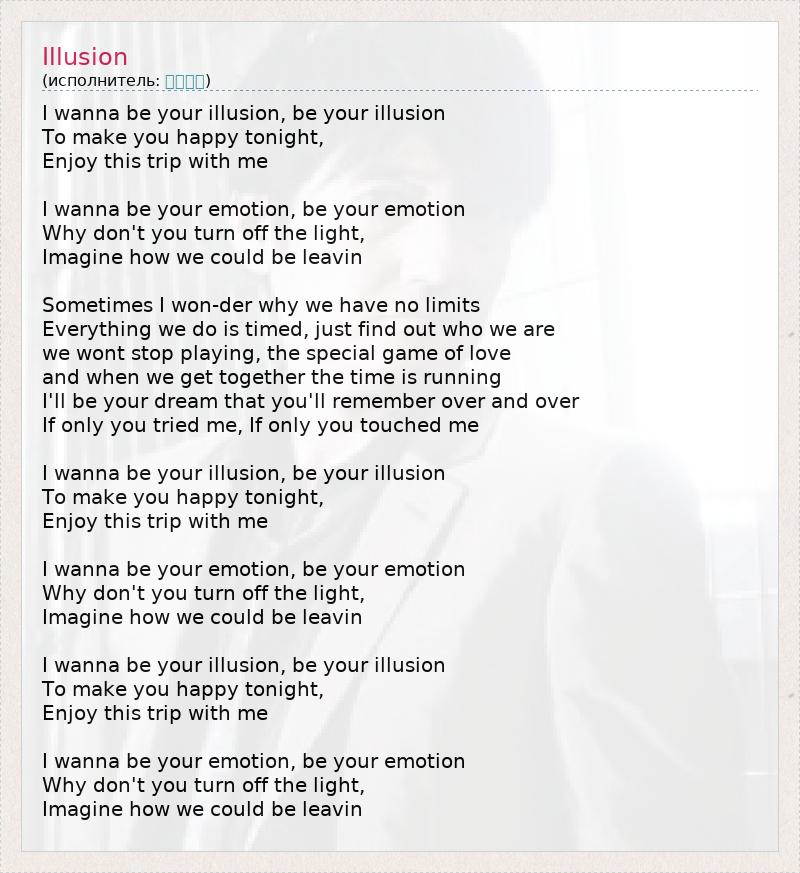 Введите перевод песниЯ хочу быть твоей иллюзией, быть вашей иллюзии Чтобы сделать вас счастливыми сегодня, Наслаждайтесь этой поездке со мной Я хочу быть твоим эмоции, ваш эмоций Почему вы не выключите свет, Представьте себе, как мы могли бы Leavin Иногда я чуда, почему у нас нет ограничений Все что мы делаем приурочен, просто выяснить, кто мы такие мы обычно прекращают игру, специальные любовной игре и когда мы собираемся вместе, время не ждет Я буду твоей мечты, что вы будете помнить снова и снова Если бы вы попытались меня, если бы ты прикоснулся ко мне Я хочу быть твоей иллюзией, быть вашей иллюзии Чтобы сделать вас счастливыми сегодня, Наслаждайтесь этой поездке со мной Я хочу быть твоим эмоции, ваш эмоций Почему вы не выключите свет, Представьте себе, как мы могли бы Leavin Я хочу быть твоей иллюзией, быть вашей иллюзии Чтобы сделать вас счастливыми сегодня, Наслаждайтесь этой поездке со мной Я хочу быть твоим эмоции, ваш эмоций Почему вы не выключите свет, Представьте себе, как мы могли бы Leavin