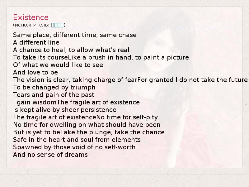 Same place, different time, same chase A different line A chance to heal, to allow what's real To take its courseLike a brush in hand, to paint a picture Of what we would like to see And love to be The vision is clear, taking charge of fearFor granted I do not take the future To be changed by triumph Tears and pain of the past I gain wisdomThe fragile art of existence Is kept alive by sheer persistence The fragile art of existenceNo time for self-pity No time for dwelling on what should have been But is yet to beTake the plunge, take the chance Safe in the heart and soul from elements Spawned by those void of no self-worth And no sense of dreams