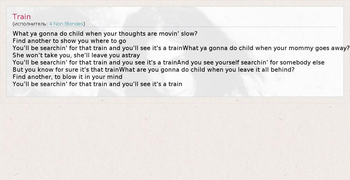 You'll be searchin' for that train and you'll see it's a trainWhat ya gonna do child when your mommy goes away?