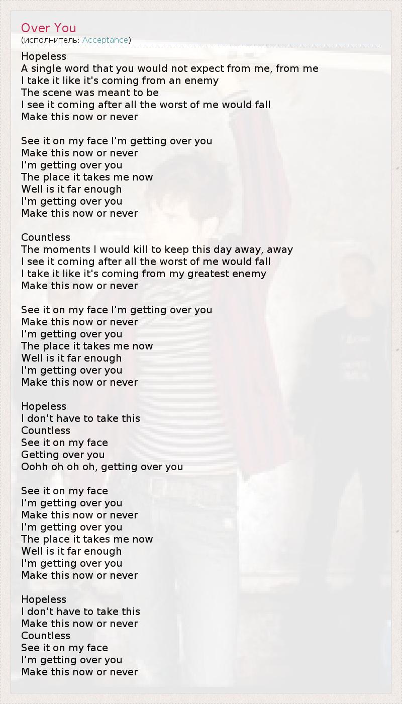 Это интересно:Acceptance - альтернативная рок-группа, образованная в Сиэтле в 1998 году. Их первый EP "Lost for Words" вышел в 2000 году, следующий - "Black Lines to Battlefields" - в 2003. Последняя пластинка "Phantoms" датирована 2005 годом.