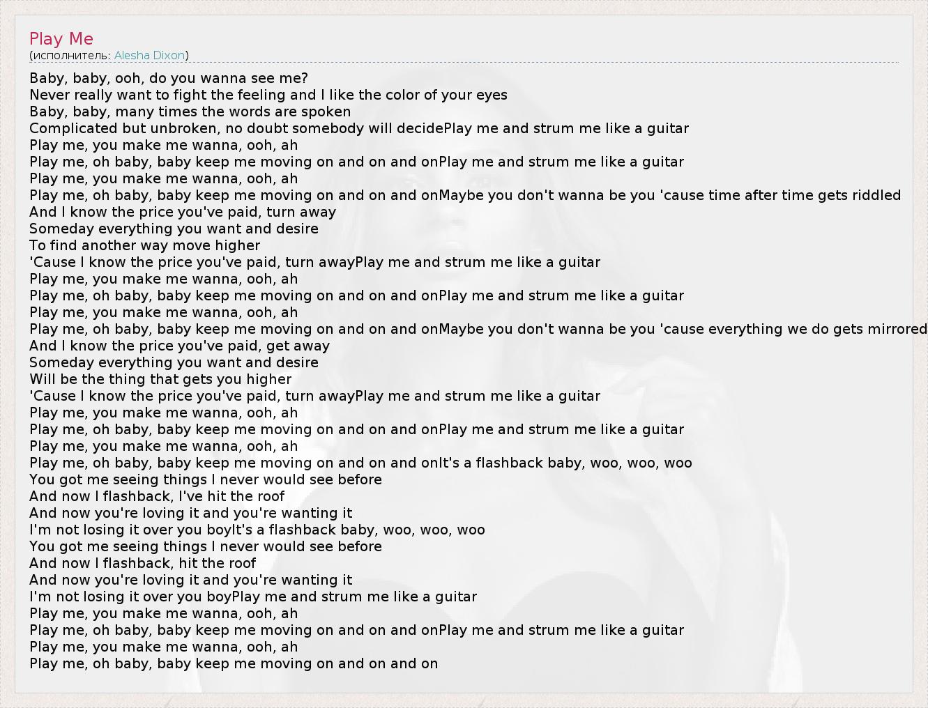 Baby, baby, ooh, do you wanna see me? Never really want to fight the feeling and I like the color of your eyes Baby, baby, many times the words are spoken Complicated but unbroken, no doubt somebody will decidePlay me and strum me like a guitar Play me, you make me wanna, ooh, ah Play me, oh baby, baby keep me moving on and on and onPlay me and strum me like a guitar Play me, you make me wanna, ooh, ah Play me, oh baby, baby keep me moving on and on and onMaybe you don't wanna be you 'cause time after time gets riddled And I know the price you've paid, turn away Someday everything you want and desire To find another way move higher 'Cause I know the price you've paid, turn awayPlay me and strum me like a guitar Play me, you make me wanna, ooh, ah Play me, oh baby, baby keep me moving on and on and onPlay me and strum me like a guitar Play me, you make me wanna, ooh, ah Play me, oh baby, baby keep me moving on and on and onMaybe you don't wanna be you 'cause everything we do gets mirrored And I know the price you've paid, get away Someday everything you want and desire Will be the thing that gets you higher 'Cause I know the price you've paid, turn awayPlay me and strum me like a guitar Play me, you make me wanna, ooh, ah Play me, oh baby, baby keep me moving on and on and onPlay me and strum me like a guitar Play me, you make me wanna, ooh, ah Play me, oh baby, baby keep me moving on and on and onIt's a flashback baby, woo, woo, woo You got me seeing things I never would see before And now I flashback, I've hit the roof And now you're loving it and you're wanting it I'm not losing it over you boyIt's a flashback baby, woo, woo, woo You got me seeing things I never would see before And now I flashback, hit the roof And now you're loving it and you're wanting it I'm not losing it over you boyPlay me and strum me like a guitar Play me, you make me wanna, ooh, ah Play me, oh baby, baby keep me moving on and on and onPlay me and strum me like a guitar Play me, you make me wanna, ooh, ah Play me, oh baby, baby keep me moving on and on and on