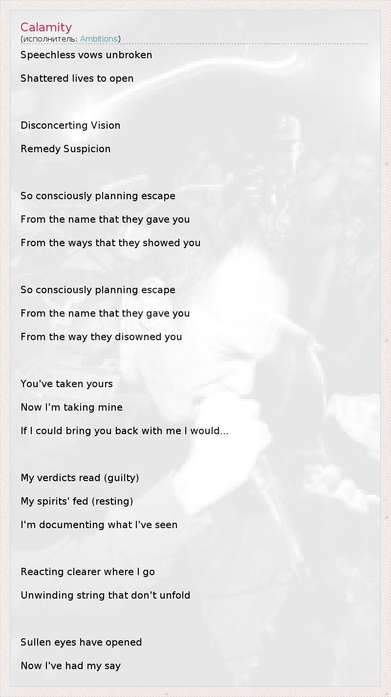 Это интересно:Ambitions began in 2005 as a way for Jay and Jeff Aust and John Ross to challenge the boundaries that separate hardcore and punk. Taking a range of diverse influences, not the least of which include Quicksand, Turning Point, Face To Face and Avail, Ambitions released a demo and began to play shows all along the east coast. In September of 2006, Ambitions released their EP "Question" on Think Fast! which garnered rave reviews and caught the attention of Bridge Nine Records. After solidifying their lineup, with guitarist Jake Woodruff and Keith "Mad Dog" Sidorowizc, Ambitions hit the road with Modern Life Is War, Bane, Have Heart, Verse, Shipwreck and more. Ambitions released their... продолжение