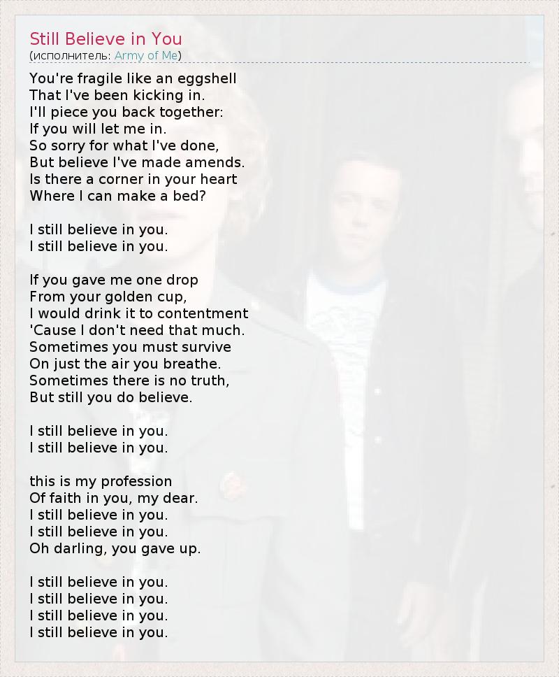 You're fragile like an eggshell That I've been kicking in. I'll piece you back together: If you will let me in. So sorry for what I've done, But believe I've made amends. Is there a corner in your heart Where I can make a bed? I still believe in you. I still believe in you. If you gave me one drop From your golden cup, I would drink it to contentment 'Cause I don't need that much. Sometimes you must survive On just the air you breathe. Sometimes there is no truth, But still you do believe. I still believe in you. I still believe in you. this is my profession Of faith in you, my dear. I still believe in you. I still believe in you. Oh darling, you gave up. I still believe in you. I still believe in you. I still believe in you. I still believe in you.