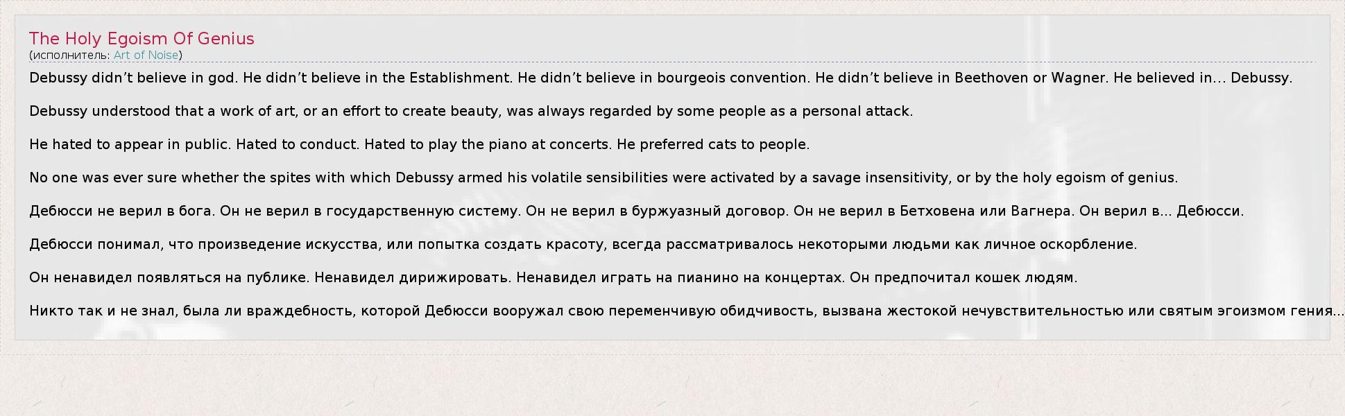Debussy didn’t believe in god. He didn’t believe in the Establishment. He didn’t believe in bourgeois convention. He didn’t believe in Beethoven or Wagner. He believed in… Debussy. Debussy understood that a work of art, or an effort to create beauty, was always regarded by some people as a personal attack. He hated to appear in public. Hated to conduct. Hated to play the piano at concerts. He preferred cats to people. No one was ever sure whether the spites with which Debussy armed his volatile sensibilities were activated by a savage insensitivity, or by the holy egoism of genius. Дебюсси не верил в бога. Он не верил в государственную систему. Он не верил в буржуазный договор. Он не верил в Бетховена или Вагнера. Он верил в... Дебюсси. Дебюсси понимал, что произведение искусства, или попытка создать красоту, всегда рассматривалось некоторыми людьми как личное оскорбление. Он ненавидел появляться на публике. Ненавидел дирижировать. Ненавидел играть на пианино на концертах. Он предпочитал кошек людям. Никто так и не знал, была ли враждебность, которой Дебюсси вооружал свою переменчивую обидчивость, вызвана жестокой нечувствительностью или святым эгоизмом гения...