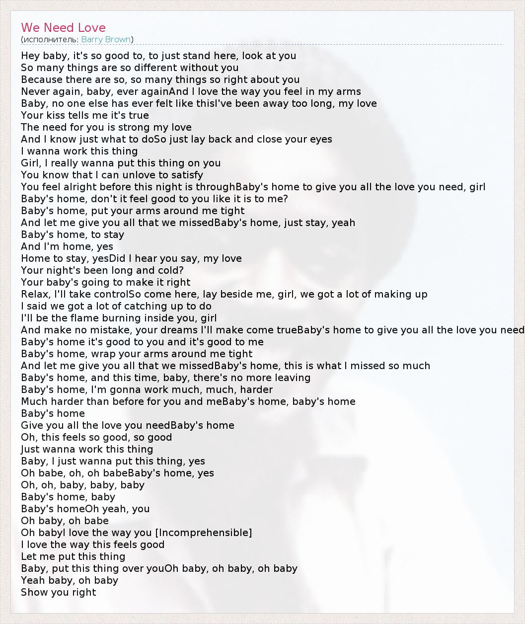 Hey baby, it's so good to, to just stand here, look at you So many things are so different without you Because there are so, so many things so right about you Never again, baby, ever againAnd I love the way you feel in my arms Baby, no one else has ever felt like thisI've been away too long, my love Your kiss tells me it's true The need for you is strong my love And I know just what to doSo just lay back and close your eyes I wanna work this thing Girl, I really wanna put this thing on you You know that I can unlove to satisfy You feel alright before this night is throughBaby's home to give you all the love you need, girl Baby's home, don't it feel good to you like it is to me? Baby's home, put your arms around me tight And let me give you all that we missedBaby's home, just stay, yeah Baby's home, to stay And I'm home, yes Home to stay, yesDid I hear you say, my love Your night's been long and cold? Your baby's going to make it right Relax, I'll take controlSo come here, lay beside me, girl, we got a lot of making up I said we got a lot of catching up to do I'll be the flame burning inside you, girl And make no mistake, your dreams I'll make come trueBaby's home to give you all the love you need Baby's home it's good to you and it's good to me Baby's home, wrap your arms around me tight And let me give you all that we missedBaby's home, this is what I missed so much Baby's home, and this time, baby, there's no more leaving Baby's home, I'm gonna work much, much, harder Much harder than before for you and meBaby's home, baby's home Baby's home Give you all the love you needBaby's home Oh, this feels so good, so good Just wanna work this thing Baby, I just wanna put this thing, yes Oh babe, oh, oh babeBaby's home, yes Oh, oh, baby, baby, baby Baby's home, baby Baby's homeOh yeah, you Oh baby, oh babe Oh babyI love the way you [Incomprehensible] I love the way this feels good Let me put this thing Baby, put this thing over youOh baby, oh baby, oh baby Yeah baby, oh baby Show you right