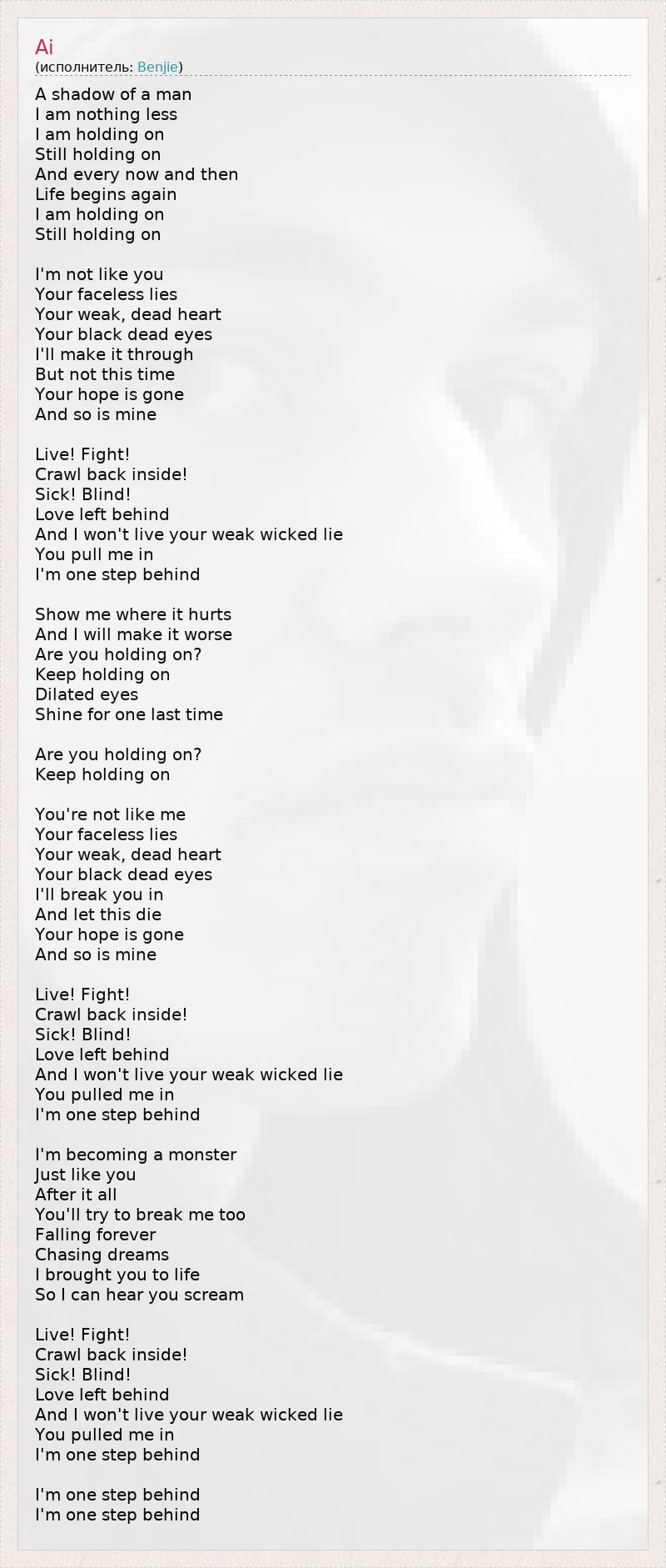 Я тень человека, Не меньше. Я держусь, Все еще держусь. И время от времени Жизнь начинается снова... Я держусь, Все еще держусь, Я не похож на тебя. Твоя безликая ложь, Твое слабое, мертвое сердце, Твои черные мертвые глаза - Я преодолею это, Но не на этот раз. Твоя надежда ушла, Как и моя. Живи! Борись! Заползи обратно внутрь! Больной! Слепой! Любовь осталась позади. И я не буду жить твоей слабой злой ложью. Ты притягиваешь меня, Я отстаю на один шаг... Покажи, где у тебя болит, И я сделаю ещё больнее. Ты держишься? Продолжай держаться! Расширенные глаза Сверкнут в последний раз... Ты держишься? Продолжай держаться! Я не похож на тебя. Твоя безликая ложь, Твое слабое, мертвое сердце, Твои черные мертвые глаза, Я уничтожу тебя И брошу умирать. Твоя надежда ушла, Как и моя. Живи! Борись! Заползи обратно внутрь! Больной! Слепой! Любовь осталась позади. И я не буду жить твоей слабой злой ложью. Ты притянула меня, Я отстаю на один шаг... Я становлюсь монстром, Так же, как ты. После того всего этого Ты попробуешь сломать и меня тоже. Вечное падение... Преследующие мечтания... Я вернул тебя к жизни, Поэтому слышу твой крик. Живи! Борись! Заползи обратно внутрь! Больной! Слепой! Любовь осталась позади. И я не буду жить твоей слабой злой ложью. Ты притянула меня, Я отстаю на один шаг... Я отстаю на один шаг... Я отстаю на один шаг...