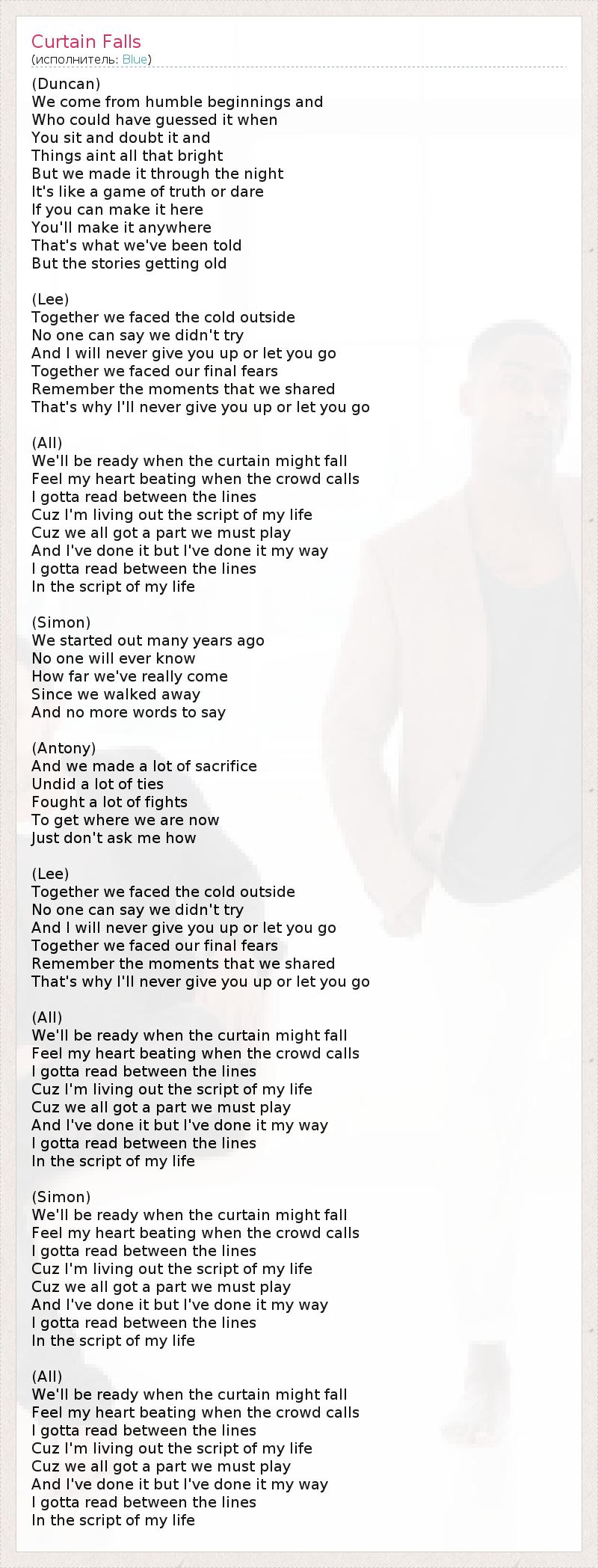 (Duncan) We come from humble beginnings and Who could have guessed it when You sit and doubt it and Things aint all that bright But we made it through the night It's like a game of truth or dare If you can make it here You'll make it anywhere That's what we've been told But the stories getting old (Lee) Together we faced the cold outside No one can say we didn't try And I will never give you up or let you go Together we faced our final fears Remember the moments that we shared That's why I'll never give you up or let you go (All) We'll be ready when the curtain might fall Feel my heart beating when the crowd calls I gotta read between the lines Cuz I'm living out the script of my life Cuz we all got a part we must play And I've done it but I've done it my way I gotta read between the lines In the script of my life (Simon) We started out many years ago No one will ever know How far we've really come Since we walked away And no more words to say (Antony) And we made a lot of sacrifice Undid a lot of ties Fought a lot of fights To get where we are now Just don't ask me how (Lee) Together we faced the cold outside No one can say we didn't try And I will never give you up or let you go Together we faced our final fears Remember the moments that we shared That's why I'll never give you up or let you go (All) We'll be ready when the curtain might fall Feel my heart beating when the crowd calls I gotta read between the lines Cuz I'm living out the script of my life Cuz we all got a part we must play And I've done it but I've done it my way I gotta read between the lines In the script of my life (Simon) We'll be ready when the curtain might fall Feel my heart beating when the crowd calls I gotta read between the lines Cuz I'm living out the script of my life Cuz we all got a part we must play And I've done it but I've done it my way I gotta read between the lines In the script of my life (All) We'll be ready when the curtain might fall Feel my heart beating when the crowd calls I gotta read between the lines Cuz I'm living out the script of my life Cuz we all got a part we must play And I've done it but I've done it my way I gotta read between the lines In the script of my life