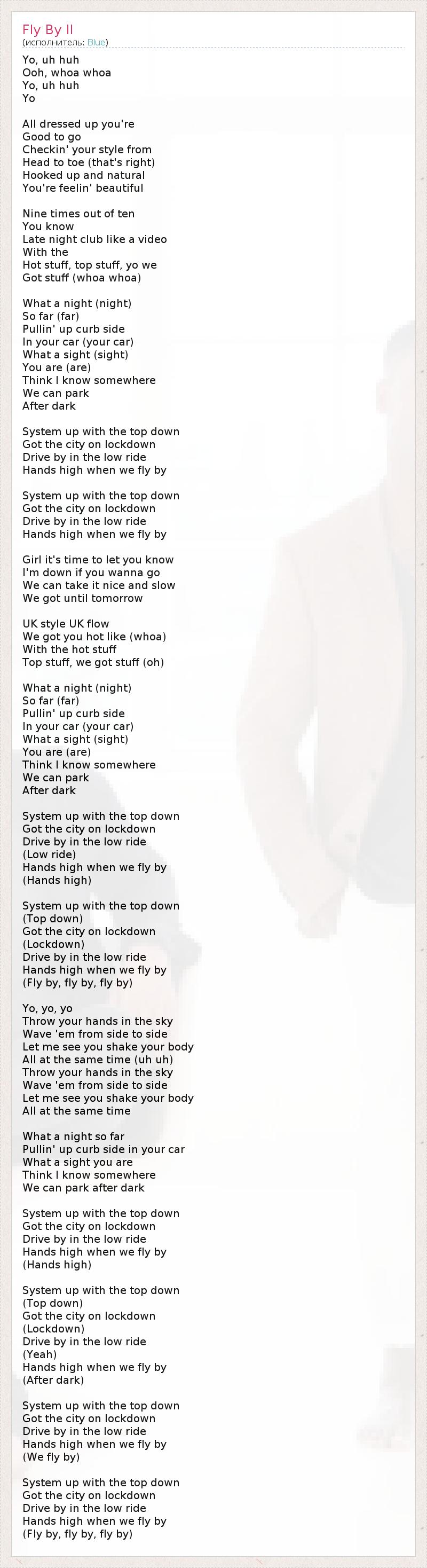 Yo, uh huh Ooh, whoa whoa Yo, uh huh Yo All dressed up you're Good to go Checkin' your style from Head to toe (that's right) Hooked up and natural You're feelin' beautiful Nine times out of ten You know Late night club like a video With the Hot stuff, top stuff, yo we Got stuff (whoa whoa) What a night (night) So far (far) Pullin' up curb side In your car (your car) What a sight (sight) You are (are) Think I know somewhere We can park After dark System up with the top down Got the city on lockdown Drive by in the low ride Hands high when we fly by System up with the top down Got the city on lockdown Drive by in the low ride Hands high when we fly by Girl it's time to let you know I'm down if you wanna go We can take it nice and slow We got until tomorrow UK style UK flow We got you hot like (whoa) With the hot stuff Top stuff, we got stuff (oh) What a night (night) So far (far) Pullin' up curb side In your car (your car) What a sight (sight) You are (are) Think I know somewhere We can park After dark System up with the top down Got the city on lockdown Drive by in the low ride (Low ride) Hands high when we fly by (Hands high) System up with the top down (Top down) Got the city on lockdown (Lockdown) Drive by in the low ride Hands high when we fly by (Fly by, fly by, fly by) Yo, yo, yo Throw your hands in the sky Wave 'em from side to side Let me see you shake your body All at the same time (uh uh) Throw your hands in the sky Wave 'em from side to side Let me see you shake your body All at the same time What a night so far Pullin' up curb side in your car What a sight you are Think I know somewhere We can park after dark System up with the top down Got the city on lockdown Drive by in the low ride Hands high when we fly by (Hands high) System up with the top down (Top down) Got the city on lockdown (Lockdown) Drive by in the low ride (Yeah) Hands high when we fly by (After dark) System up with the top down Got the city on lockdown Drive by in the low ride Hands high when we fly by (We fly by) System up with the top down Got the city on lockdown Drive by in the low ride Hands high when we fly by (Fly by, fly by, fly by)