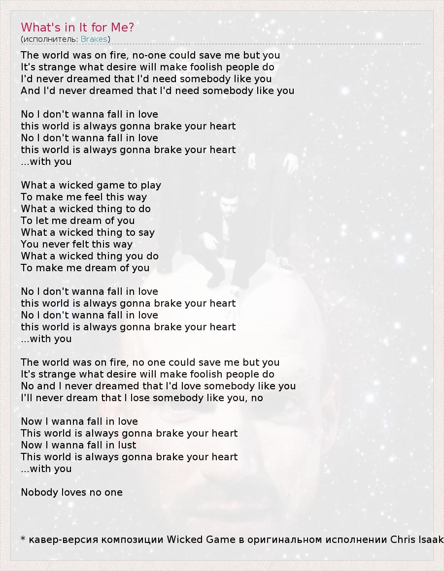 The world was on fire, no-one could save me but you It's strange what desire will make foolish people do I'd never dreamed that I'd need somebody like you And I'd never dreamed that I'd need somebody like you No I don't wanna fall in love this world is always gonna brake your heart No I don't wanna fall in love this world is always gonna brake your heart ...with you What a wicked game to play To make me feel this way What a wicked thing to do To let me dream of you What a wicked thing to say You never felt this way What a wicked thing you do To make me dream of you No I don't wanna fall in love this world is always gonna brake your heart No I don't wanna fall in love this world is always gonna brake your heart ...with you The world was on fire, no one could save me but you It's strange what desire will make foolish people do No and I never dreamed that I'd love somebody like you I'll never dream that I lose somebody like you, no Now I wanna fall in love This world is always gonna brake your heart Now I wanna fall in lust This world is always gonna brake your heart ...with you Nobody loves no one * кавер-версия композиции Wicked Game в оригинальном исполнении Chris Isaak