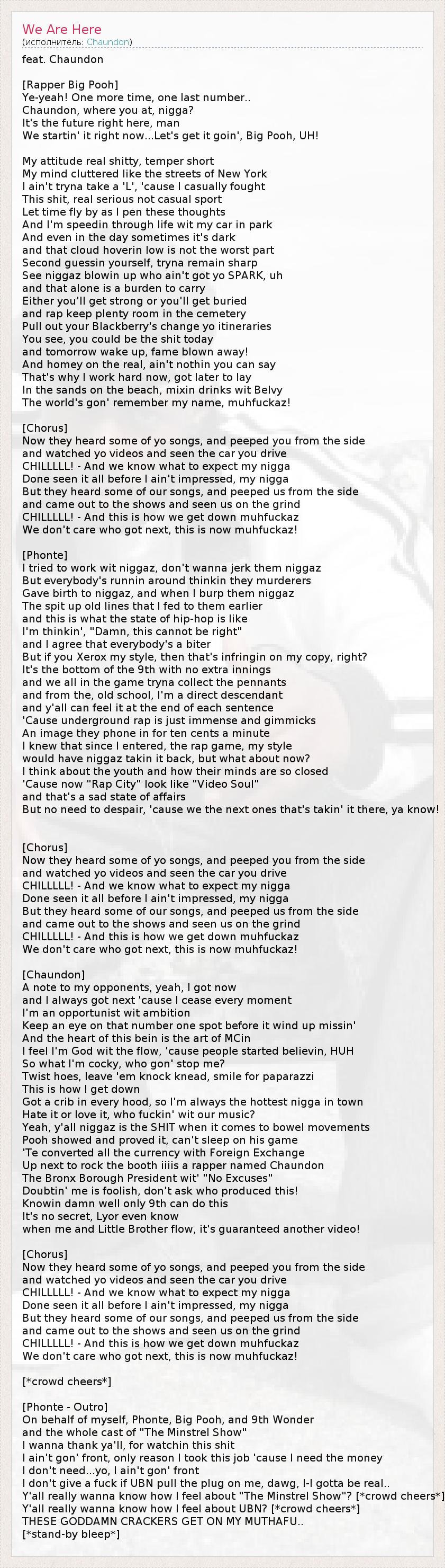 feat. Chaundon [Rapper Big Pooh] Ye-yeah! One more time, one last number.. Chaundon, where you at, nigga? It's the future right here, man We startin' it right now...Let's get it goin', Big Pooh, UH! My attitude real shitty, temper short My mind cluttered like the streets of New York I ain't tryna take a 'L', 'cause I casually fought This shit, real serious not casual sport Let time fly by as I pen these thoughts And I'm speedin through life wit my car in park And even in the day sometimes it's dark and that cloud hoverin low is not the worst part Second guessin yourself, tryna remain sharp See niggaz blowin up who ain't got yo SPARK, uh and that alone is a burden to carry Either you'll get strong or you'll get buried and rap keep plenty room in the cemetery Pull out your Blackberry's change yo itineraries You see, you could be the shit today and tomorrow wake up, fame blown away! And homey on the real, ain't nothin you can say That's why I work hard now, got later to lay In the sands on the beach, mixin drinks wit Belvy The world's gon' remember my name, muhfuckaz! [Chorus] Now they heard some of yo songs, and peeped you from the side and watched yo videos and seen the car you drive CHILLLLL! - And we know what to expect my nigga Done seen it all before I ain't impressed, my nigga But they heard some of our songs, and peeped us from the side and came out to the shows and seen us on the grind CHILLLLL! - And this is how we get down muhfuckaz We don't care who got next, this is now muhfuckaz! [Phonte] I tried to work wit niggaz, don't wanna jerk them niggaz But everybody's runnin around thinkin they murderers Gave birth to niggaz, and when I burp them niggaz The spit up old lines that I fed to them earlier and this is what the state of hip-hop is like I'm thinkin', "Damn, this cannot be right" and I agree that everybody's a biter But if you Xerox my style, then that's infringin on my copy, right? It's the bottom of the 9th with no extra innings and we all in the game tryna collect the pennants and from the, old school, I'm a direct descendant and y'all can feel it at the end of each sentence 'Cause underground rap is just immense and gimmicks An image they phone in for ten cents a minute I knew that since I entered, the rap game, my style would have niggaz takin it back, but what about now? I think about the youth and how their minds are so closed 'Cause now "Rap City" look like "Video Soul" and that's a sad state of affairs But no need to despair, 'cause we the next ones that's takin' it there, ya know! [Chorus] Now they heard some of yo songs, and peeped you from the side and watched yo videos and seen the car you drive CHILLLLL! - And we know what to expect my nigga Done seen it all before I ain't impressed, my nigga But they heard some of our songs, and peeped us from the side and came out to the shows and seen us on the grind CHILLLLL! - And this is how we get down muhfuckaz We don't care who got next, this is now muhfuckaz! [Chaundon] A note to my opponents, yeah, I got now and I always got next 'cause I cease every moment I'm an opportunist wit ambition Keep an eye on that number one spot before it wind up missin' And the heart of this bein is the art of MCin I feel I'm God wit the flow, 'cause people started believin, HUH So what I'm cocky, who gon' stop me? Twist hoes, leave 'em knock knead, smile for paparazzi This is how I get down Got a crib in every hood, so I'm always the hottest nigga in town Hate it or love it, who fuckin' wit our music? Yeah, y'all niggaz is the SHIT when it comes to bowel movements Pooh showed and proved it, can't sleep on his game 'Te converted all the currency with Foreign Exchange Up next to rock the booth iiiis a rapper named Chaundon The Bronx Borough President wit' "No Excuses" Doubtin' me is foolish, don't ask who produced this! Knowin damn well only 9th can do this It's no secret, Lyor even know when me and Little Brother flow, it's guaranteed another video! [Chorus] Now they heard some of yo songs, and peeped you from the side and watched yo videos and seen the car you drive CHILLLLL! - And we know what to expect my nigga Done seen it all before I ain't impressed, my nigga But they heard some of our songs, and peeped us from the side and came out to the shows and seen us on the grind CHILLLLL! - And this is how we get down muhfuckaz We don't care who got next, this is now muhfuckaz! [*crowd cheers*] [Phonte - Outro] On behalf of myself, Phonte, Big Pooh, and 9th Wonder and the whole cast of "The Minstrel Show" I wanna thank ya'll, for watchin this shit I ain't gon' front, only reason I took this job 'cause I need the money I don't need...yo, I ain't gon' front I don't give a fuck if UBN pull the plug on me, dawg, I-I gotta be real.. Y'all really wanna know how I feel about "The Minstrel Show"? [*crowd cheers*] Y'all really wanna know how I feel about UBN? [*crowd cheers*] THESE GODDAMN CRACKERS GET ON MY MUTHAFU.. [*stand-by bleep*]