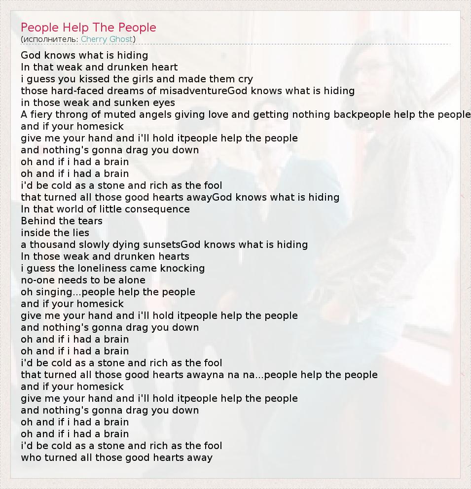 God knows what is hiding In that weak and drunken heart i guess you kissed the girls and made them cry those hard-faced dreams of misadventureGod knows what is hiding in those weak and sunken eyes A fiery throng of muted angels giving love and getting nothing backpeople help the people and if your homesick give me your hand and i'll hold itpeople help the people and nothing's gonna drag you down oh and if i had a brain oh and if i had a brain i'd be cold as a stone and rich as the fool that turned all those good hearts awayGod knows what is hiding In that world of little consequence Behind the tears inside the lies a thousand slowly dying sunsetsGod knows what is hiding In those weak and drunken hearts i guess the loneliness came knocking no-one needs to be alone oh singing...people help the people and if your homesick give me your hand and i'll hold itpeople help the people and nothing's gonna drag you down oh and if i had a brain oh and if i had a brain i'd be cold as a stone and rich as the fool that turned all those good hearts awayna na na...people help the people and if your homesick give me your hand and i'll hold itpeople help the people and nothing's gonna drag you down oh and if i had a brain oh and if i had a brain i'd be cold as a stone and rich as the fool who turned all those good hearts away