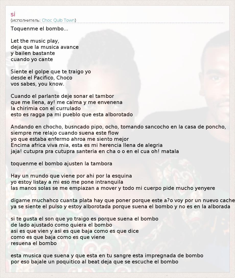Toquenme el bombo... Let the music play, deja que la musica avance y bailen bastante cuando yo cante Siente el golpe que te traigo yo desde el Pacifico, Choco vos sabes, you know. Cuando el parlante deje sonar el tambor que me llena, ay! me calma y me envenena la chirimia con el currulado esto es ragga pa mi pueblo que esta alborotado Andando en chocho, busncado pipo, ocho, tomando sancocho en la casa de poncho, siempre me relajo cuando suena este flow yo que estaba enfermo ahroa me siento mejor Encima africa viva mia, esta es mi herencia llena de alegria jaja! cutupra pra cutupra santeria en cha o o en el cua oh! matala toquenme el bombo ajusten la tambora Hay un mundo que viene por ahi por la esquina yo estoy listay a mi eso me pone intranquila las manos solas se me empiazan a mover y todo mi cuerpo pide mucho yenyere digame muchahco cuanta plata hay que poner porque este a?o voy por un nuevo cache ya se siente el pulso y estoy alborotada porque suena el bombo y no es en la alborada si te gusta el son que yo traigo es porque suena el bombo de lado ajustado como quiera el bombo asi es que vien y asi es que baja como es que dice como es que baja como es que viene resuena el bombo esta musica que suena y que esta en tu sangre esta impregnada de bombo por eso bajale un poquitico al beat deja que se escuche el bombo