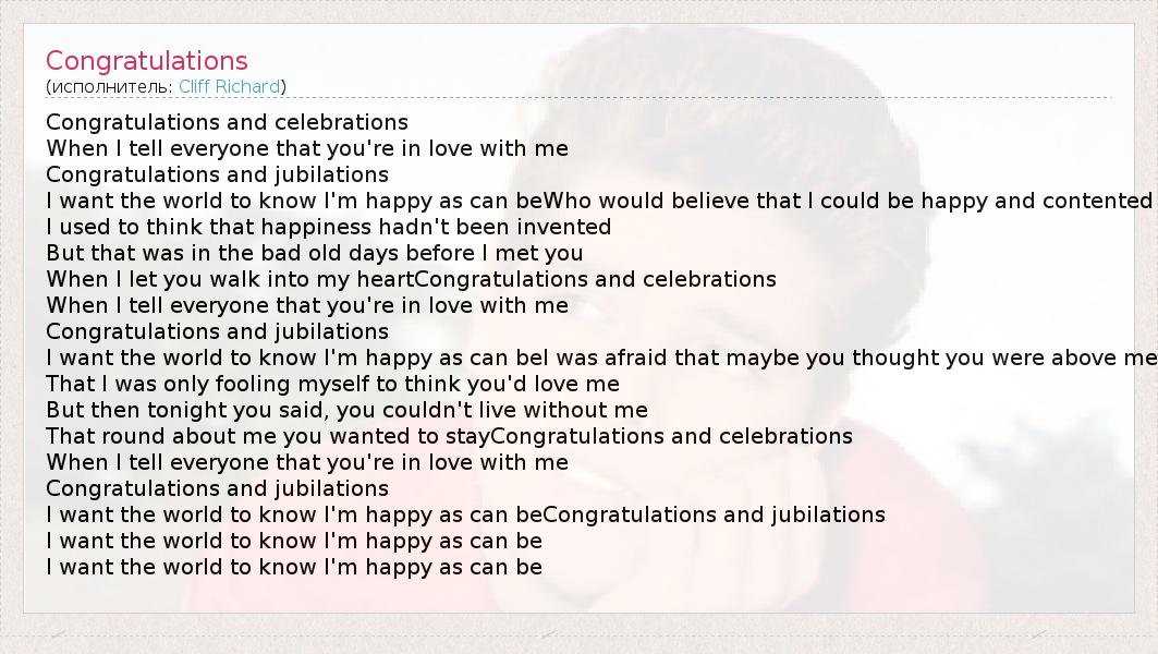 Congratulations and celebrations When I tell everyone that you're in love with me Congratulations and jubilations I want the world to know I'm happy as can beWho would believe that I could be happy and contented I used to think that happiness hadn't been invented But that was in the bad old days before I met you When I let you walk into my heartCongratulations and celebrations When I tell everyone that you're in love with me Congratulations and jubilations I want the world to know I'm happy as can beI was afraid that maybe you thought you were above me That I was only fooling myself to think you'd love me But then tonight you said, you couldn't live without me That round about me you wanted to stayCongratulations and celebrations When I tell everyone that you're in love with me Congratulations and jubilations I want the world to know I'm happy as can beCongratulations and jubilations I want the world to know I'm happy as can be I want the world to know I'm happy as can be