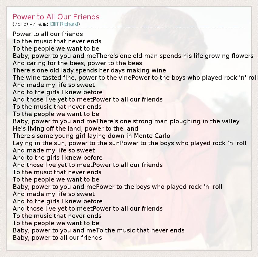 Power to all our friends To the music that never ends To the people we want to be Baby, power to you and meThere's one old man spends his life growing flowers And caring for the bees, power to the bees There's one old lady spends her days making wine The wine tasted fine, power to the vinePower to the boys who played rock 'n' roll And made my life so sweet And to the girls I knew before And those I've yet to meetPower to all our friends To the music that never ends To the people we want to be Baby, power to you and meThere's one strong man ploughing in the valley He's living off the land, power to the land There's some young girl laying down in Monte Carlo Laying in the sun, power to the sunPower to the boys who played rock 'n' roll And made my life so sweet And to the girls I knew before And those I've yet to meetPower to all our friends To the music that never ends To the people we want to be Baby, power to you and mePower to the boys who played rock 'n' roll And made my life so sweet And to the girls I knew before And those I've yet to meetPower to all our friends To the music that never ends To the people we want to be Baby, power to you and meTo the music that never ends Baby, power to all our friends