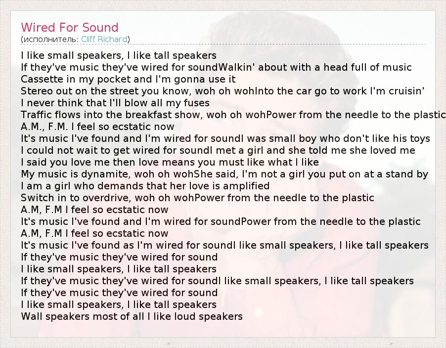 I like small speakers, I like tall speakers If they've music they've wired for soundWalkin' about with a head full of music Cassette in my pocket and I'm gonna use it Stereo out on the street you know, woh oh wohInto the car go to work I'm cruisin' I never think that I'll blow all my fuses Traffic flows into the breakfast show, woh oh wohPower from the needle to the plastic A.M., F.M. I feel so ecstatic now It's music I've found and I'm wired for soundI was small boy who don't like his toys I could not wait to get wired for soundI met a girl and she told me she loved me I said you love me then love means you must like what I like My music is dynamite, woh oh wohShe said, I'm not a girl you put on at a stand by I am a girl who demands that her love is amplified Switch in to overdrive, woh oh wohPower from the needle to the plastic A.M, F.M I feel so ecstatic now It's music I've found and I'm wired for soundPower from the needle to the plastic A.M, F.M I feel so ecstatic now It's music I've found as I'm wired for soundI like small speakers, I like tall speakers If they've music they've wired for sound I like small speakers, I like tall speakers If they've music they've wired for soundI like small speakers, I like tall speakers If they've music they've wired for sound I like small speakers, I like tall speakers Wall speakers most of all I like loud speakers