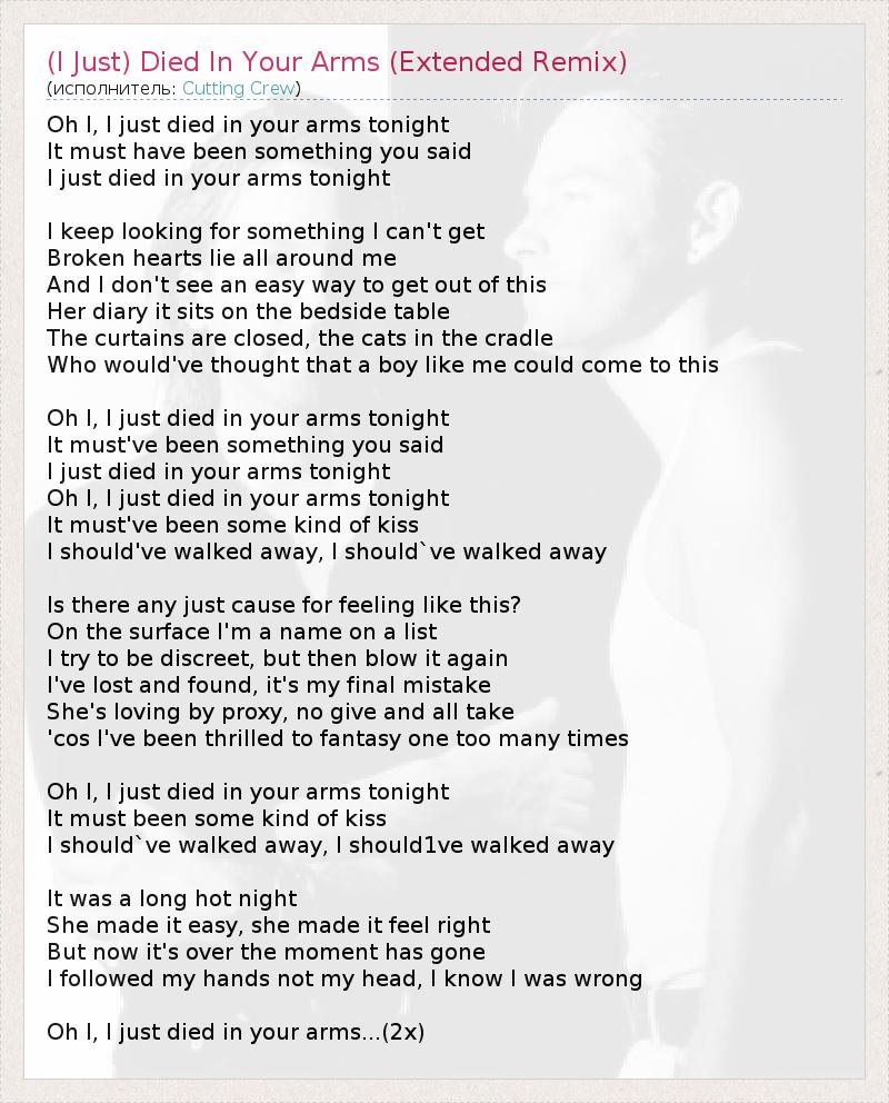 Оо я, я просто умер в твоих объятиях, Должно быть, от твоих слов… Я просто умер в твоих объятиях… Я ищу что-то, что не смогу найти, Разбитые сердца лежат вокруг меня. И я не вижу способа избавиться от этого… Её дневник живёт на прикроватном столике, Шторы опущены, котята в лукошке… Кто бы мог подумать, что парень вроде Меня может до такого докатиться? Я просто умер в твоих объятиях Должно быть, от твоих слов… Я просто умер в твоих объятиях… Я просто умер в твоих объятиях, Должно быть, от твоих поцелуев… Нужно было остановиться, но я не смог. Есть ли всему этому разумное объяснение? На первый взгляд - я самый обыкновенный человек. Я пытаюсь быть благоразумным, но ничего не выходит. Я терял и находил, но эта моя ошибка - последняя. Она любит по доверенности, всё берёт, не давая ничего. Но в моих фантазиях живёт лишь она одна. Я просто умер в твоих объятиях Должно быть, от твоих слов… Я просто умер в твоих объятиях… Я просто умер в твоих объятиях, Должно быть, от твоих поцелуев… Нужно было остановиться, но я не смог… Ночь была долгой и жаркой, Но с нею время пролетело незаметно. Теперь всё закончилось, всё прошло… Я шёл туда, куда меня вели руки, не голова, и я знал, Что не стоило этого делать… Я просто умер в твоих объятиях Должно быть, от твоих слов… Я просто умер в твоих объятиях… Я просто умер в твоих объятиях, Должно быть, от твоих поцелуев… Нужно было остановиться, но я не смог…