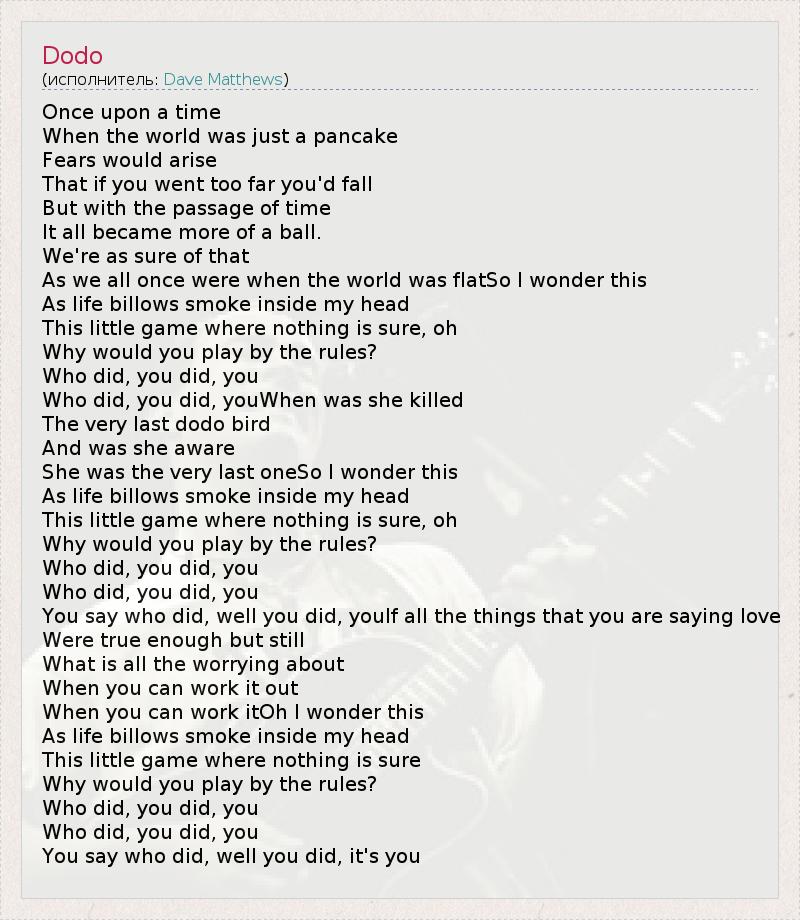 Once upon a time When the world was just a pancake Fears would arise That if you went too far you'd fall But with the passage of time It all became more of a ball. We're as sure of that As we all once were when the world was flatSo I wonder this As life billows smoke inside my head This little game where nothing is sure, oh Why would you play by the rules? Who did, you did, you Who did, you did, youWhen was she killed The very last dodo bird And was she aware She was the very last oneSo I wonder this As life billows smoke inside my head This little game where nothing is sure, oh Why would you play by the rules? Who did, you did, you Who did, you did, you You say who did, well you did, youIf all the things that you are saying love Were true enough but still What is all the worrying about When you can work it out When you can work itOh I wonder this As life billows smoke inside my head This little game where nothing is sure Why would you play by the rules? Who did, you did, you Who did, you did, you You say who did, well you did, it's you
