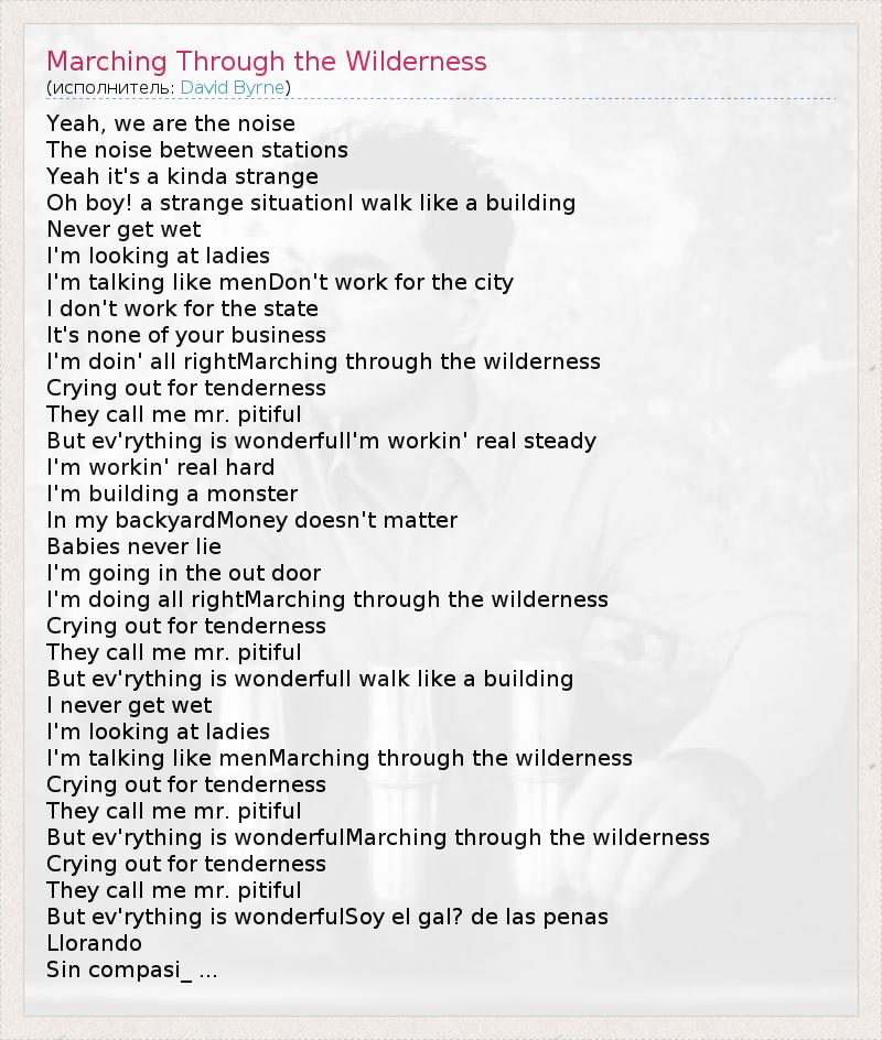 Yeah, we are the noise The noise between stations Yeah it's a kinda strange Oh boy! a strange situationI walk like a building Never get wet I'm looking at ladies I'm talking like menDon't work for the city I don't work for the state It's none of your business I'm doin' all rightMarching through the wilderness Crying out for tenderness They call me mr. pitiful But ev'rything is wonderfulI'm workin' real steady I'm workin' real hard I'm building a monster In my backyardMoney doesn't matter Babies never lie I'm going in the out door I'm doing all rightMarching through the wilderness Crying out for tenderness They call me mr. pitiful But ev'rything is wonderfulI walk like a building I never get wet I'm looking at ladies I'm talking like menMarching through the wilderness Crying out for tenderness They call me mr. pitiful But ev'rything is wonderfulMarching through the wilderness Crying out for tenderness They call me mr. pitiful But ev'rything is wonderfulSoy el gal? de las penas Llorando Sin compasi_ ...
