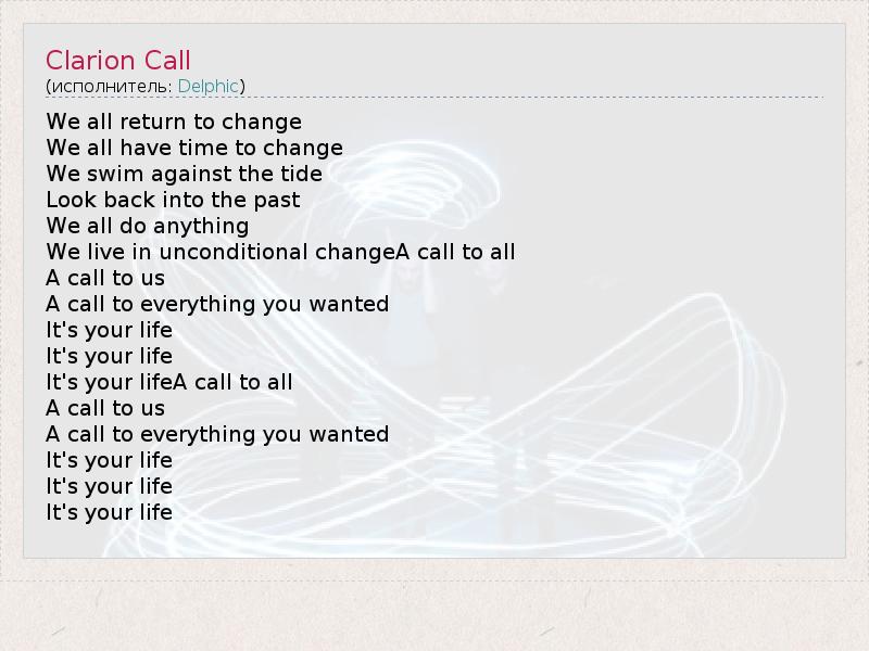 We all return to change We all have time to change We swim against the tide Look back into the past We all do anything We live in unconditional changeA call to all A call to us A call to everything you wanted It's your life It's your life It's your lifeA call to all A call to us A call to everything you wanted It's your life It's your life It's your life