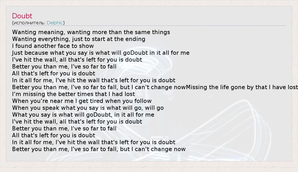 Wanting meaning, wanting more than the same things Wanting everything, just to start at the ending I found another face to show Just because what you say is what will goDoubt in it all for me I've hit the wall, all that's left for you is doubt Better you than me, I've so far to fall All that's left for you is doubt In it all for me, I've hit the wall that's left for you is doubt Better you than me, I've so far to fall, but I can't change nowMissing the life gone by that I have lost I'm missing the better times that I had lost When you're near me I get tired when you follow When you speak what you say is what will go, will go What you say is what will goDoubt, in it all for me I've hit the wall, all that's left for you is doubt Better you than me, I've so far to fall All that's left for you is doubt In it all for me, I've hit the wall that's left for you is doubt Better you than me, I've so far to fall, but I can't change now