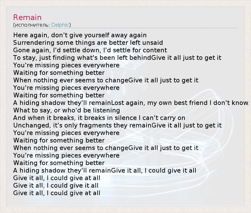 Here again, don't give yourself away again Surrendering some things are better left unsaid Gone again, I'd settle down, I'd settle for content To stay, just finding what's been left behindGive it all just to get it You're missing pieces everywhere Waiting for something better When nothing ever seems to changeGive it all just to get it You're missing pieces everywhere Waiting for something better A hiding shadow they'll remainLost again, my own best friend I don't know What to say, or who'd be listening And when it breaks, it breaks in silence I can't carry on Unchanged, it's only fragments they remainGive it all just to get it You're missing pieces everywhere Waiting for something better When nothing ever seems to changeGive it all just to get it You're missing pieces everywhere Waiting for something better A hiding shadow they'll remainGive it all, I could give it all Give it all, I could give at all Give it all, I could give it all Give it all, I could give at all