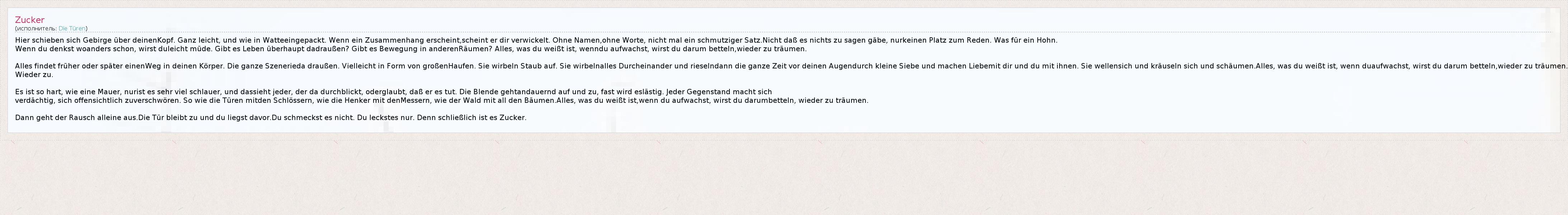 Dann geht der Rausch alleine aus.Die Tür bleibt zu und du liegst davor.Du schmeckst es nicht. Du leckstes nur. Denn schließlich ist es Zucker.