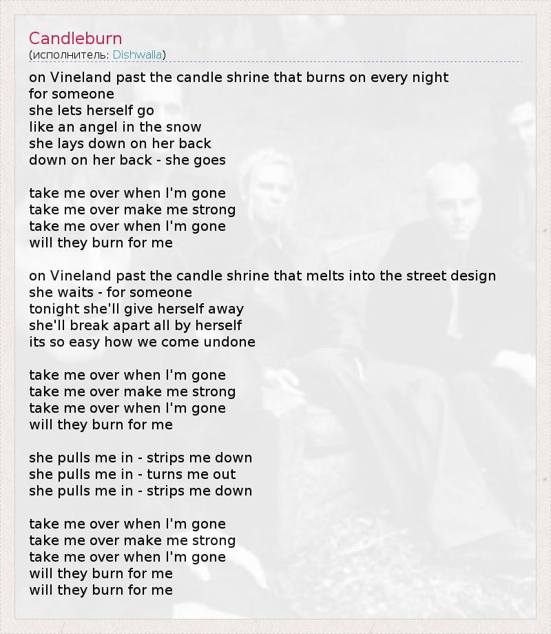 on Vineland past the candle shrine that burns on every night for someone she lets herself go like an angel in the snow she lays down on her back down on her back - she goes take me over when I'm gone take me over make me strong take me over when I'm gone will they burn for me on Vineland past the candle shrine that melts into the street design she waits - for someone tonight she'll give herself away she'll break apart all by herself its so easy how we come undone take me over when I'm gone take me over make me strong take me over when I'm gone will they burn for me she pulls me in - strips me down she pulls me in - turns me out she pulls me in - strips me down take me over when I'm gone take me over make me strong take me over when I'm gone will they burn for me will they burn for me