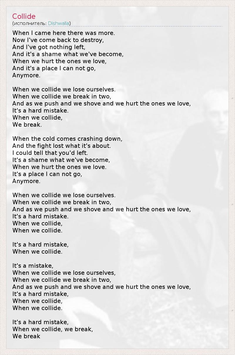 When I came here there was more. Now I've come back to destroy, And I've got nothing left, And it's a shame what we've become, When we hurt the ones we love, And it's a place I can not go, Anymore. When we collide we lose ourselves. When we collide we break in two, And as we push and we shove and we hurt the ones we love, It's a hard mistake. When we collide, We break. When the cold comes crashing down, And the fight lost what it's about. I could tell that you'd left. It's a shame what we've become, When we hurt the ones we love. It's a place I can not go, Anymore. When we collide we lose ourselves. When we collide we break in two, And as we push and we shove and we hurt the ones we love, It's a hard mistake. When we collide, When we collide. It's a hard mistake, When we collide. It's a mistake, When we collide we lose ourselves, When we collide we break in two, And as we push and we shove and we hurt the ones we love, It's a hard mistake, When we collide, When we collide. It's a hard mistake, When we collide, we break, We break