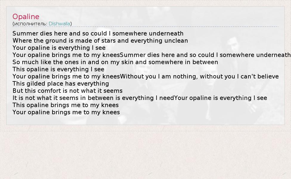 Summer dies here and so could I somewhere underneath Where the ground is made of stars and everything unclean Your opaline is everything I see Your opaline brings me to my kneesSummer dies here and so could I somewhere underneath So much like the ones in and on my skin and somewhere in between This opaline is everything I see Your opaline brings me to my kneesWithout you I am nothing, without you I can't believe This gilded place has everything But this comfort is not what it seems It is not what it seems in between is everything I needYour opaline is everything I see This opaline brings me to my knees Your opaline brings me to my knees