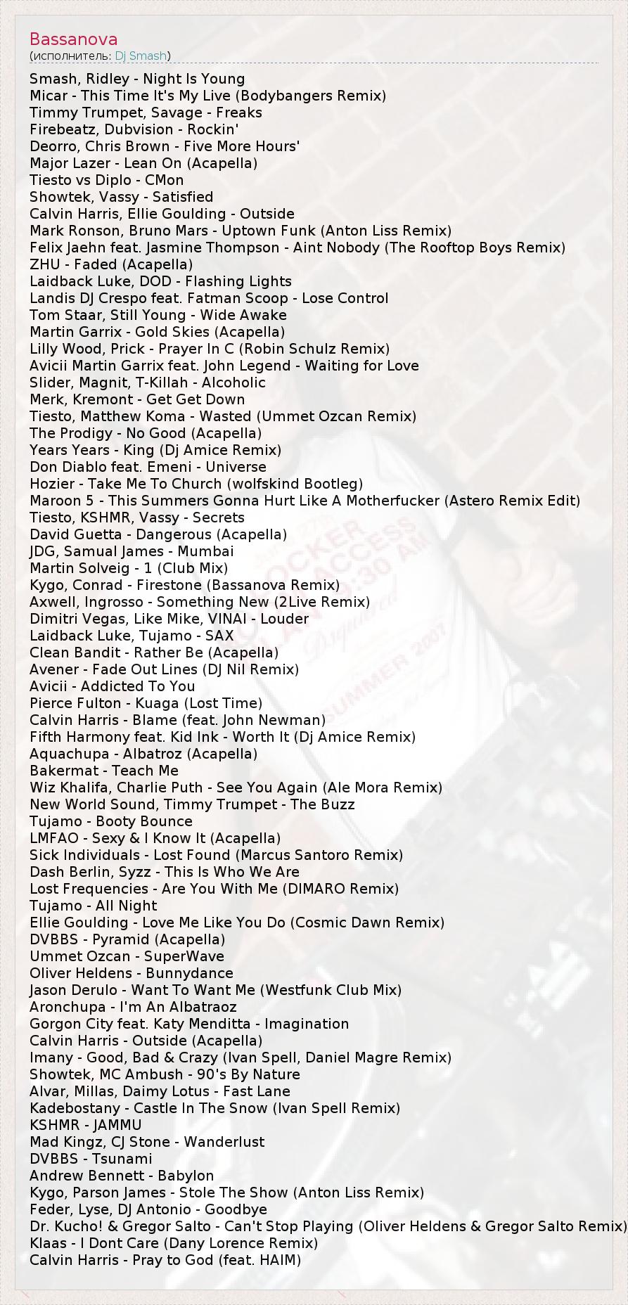 Это интересно:DJ Smash (настоящее имя — Ширман Андрей Леонидович) — российский диджей, пишет электронную музыку. Окончил МГУКИ.Творческую карьеру начинал резидентом в клубах Москвы: «Шамбала», «Zima Prожект», «L’eto Prожект», «Осень Prожект», «DяgileV Prожект».Стал известен широкой общественности после выхода в 2007 году сингла «Moscow Never Sleeps» («Москва никогда не спит»), который попал в ротацию крупнейшей радиостанции... продолжение