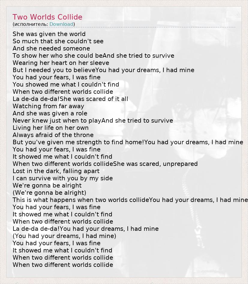 She was given the world So much that she couldn't see And she needed someone To show her who she could beAnd she tried to survive Wearing her heart on her sleeve But I needed you to believeYou had your dreams, I had mine You had your fears, I was fine You showed me what I couldn't find When two different worlds collide La de-da de-da!She was scared of it all Watching from far away And she was given a role Never knew just when to playAnd she tried to survive Living her life on her own Always afraid of the throne But you've given me strength to find home!You had your dreams, I had mine You had your fears, I was fine It showed me what I couldn't find When two different worlds collideShe was scared, unprepared Lost in the dark, falling apart I can survive with you by my side We're gonna be alright (We're gonna be alright) This is what happens when two worlds collideYou had your dreams, I had mine You had your fears, I was fine It showed me what I couldn't find When two different worlds collide La de-da de-da!You had your dreams, I had mine (You had your dreams, I had mine) You had your fears, I was fine It showed me what I couldn't find When two different worlds collide When two different worlds collide