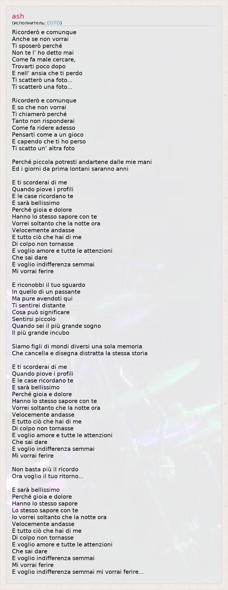 Ricorderò e comunque Anche se non vorrai Ti sposerò perché Non te l' ho detto mai Come fa male cercare, Trovarti poco dopo E nell' ansia che ti perdo Ti scatterò una foto... Ti scatterò una foto... Ricorderò e comunque E so che non vorrai Ti chiamerò perché Tanto non risponderai Come fa ridere adesso Pensarti come a un gioco E capendo che ti ho perso Ti scatto un' altra foto Perché piccola potresti andartene dalle mie mani Ed i giorni da prima lontani saranno anni E ti scorderai di me Quando piove i profili E le case ricordano te E sarà bellissimo Perché gioia e dolore Hanno lo stesso sapore con te Vorrei soltanto che la notte ora Velocemente andasse E tutto ciò che hai di me Di colpo non tornasse E voglio amore e tutte le attenzioni Che sai dare E voglio indifferenza semmai Mi vorrai ferire E riconobbi il tuo sguardo In quello di un passante Ma pure avendoti qui Ti sentirei distante Cosa può significare Sentirsi piccolo Quando sei il più grande sogno Il più grande incubo Siamo figli di mondi diversi una sola memoria Che cancella e disegna distratta la stessa storia E ti scorderai di me Quando piove i profili E le case ricordano te E sarà bellissimo Perché gioia e dolore Hanno lo stesso sapore con te Vorrei soltanto che la notte ora Velocemente andasse E tutto ciò che hai di me Di colpo non tornasse E voglio amore e tutte le attenzioni Che sai dare E voglio indifferenza semmai Mi vorrai ferire Non basta più il ricordo Ora voglio il tuo ritorno... E sarà bellissimo Perché gioia e dolore Hanno lo stesso sapore Lo stesso sapore con te Io vorrei soltanto che la notte ora Velocemente andasse E tutto ciò che hai di me Di colpo non tornasse E voglio amore e tutte le attenzioni Che sai dare E voglio indifferenza semmai Mi vorrai ferire E voglio indifferenza semmai mi vorrai ferire...