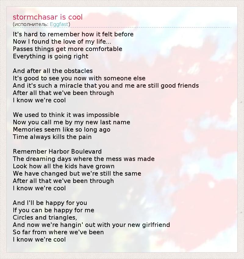 It's hard to remember how it felt before Now I found the love of my life... Passes things get more comfortable Everything is going right And after all the obstacles It's good to see you now with someone else And it's such a miracle that you and me are still good friends After all that we've been through I know we're cool We used to think it was impossible Now you call me by my new last name Memories seem like so long ago Time always kills the pain Remember Harbor Boulevard The dreaming days where the mess was made Look how all the kids have grown We have changed but we're still the same After all that we've been through I know we're cool And I'll be happy for you If you can be happy for me Circles and triangles, And now we're hangin' out with your new girlfriend So far from where we've been I know we're cool